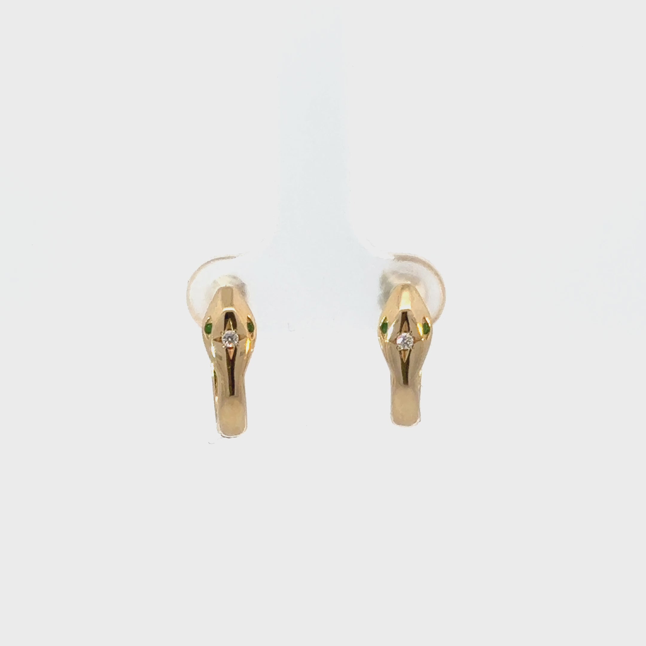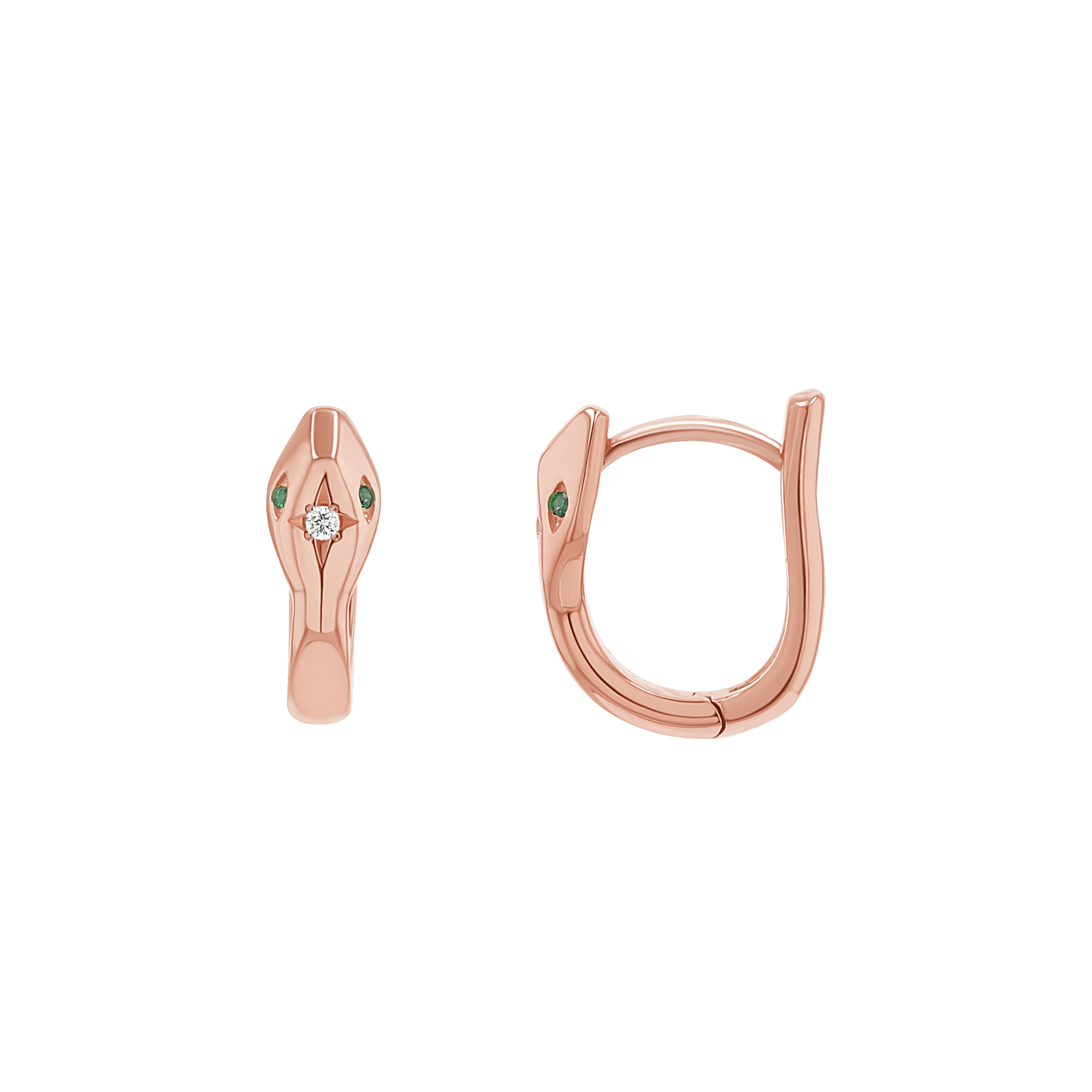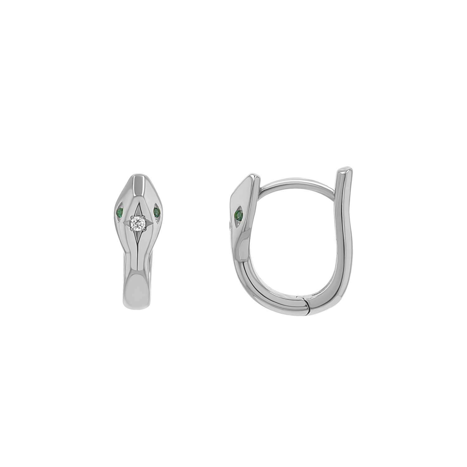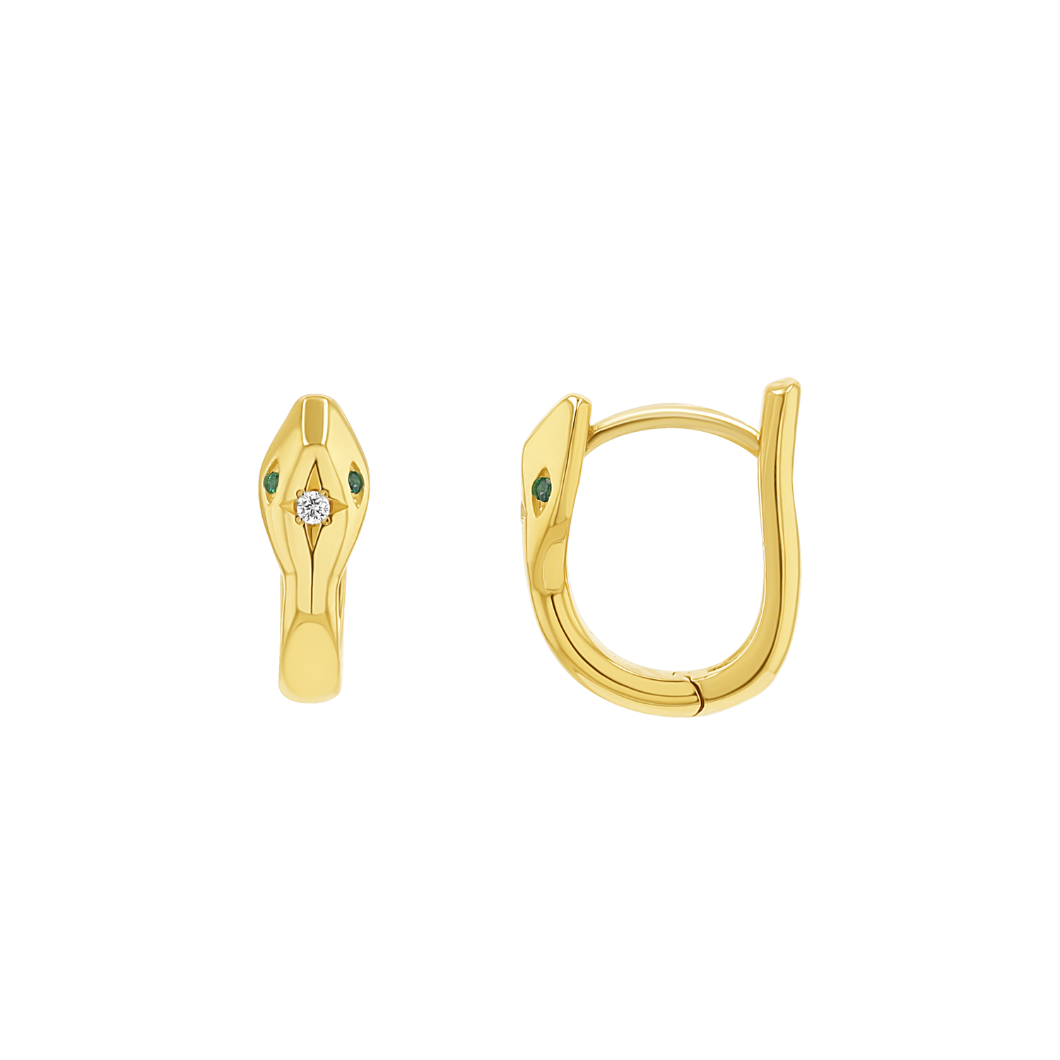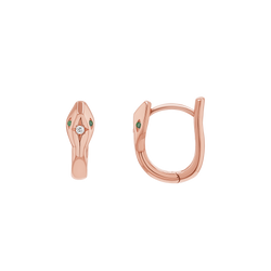 Introducing our Starset Diamond Serpentine Huggie, a testament to your unique style and refined taste. A secure and comfortable fit, you will be captivated by the allure of the serpent with these show stopping huggies. The smooth curves and intricate details of the snake head are topped off with a center diamond and emerald accented eyes. This timeless design symbolizes transformation, protection, and timeless beauty. Perfect for adding a bold yet sophisticated accent to any outfit!
