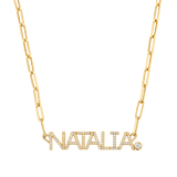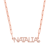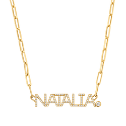 The hottest new name necklace in the game has arrived! Our Custom Paper Clip Diamond Name Necklace exudes luxury pairing a paper clip chain with a diamond name. Personalized and dripping with diamonds, each name includes a bezel set diamond at the end. You will surely turn heads and stun with this forever piece.