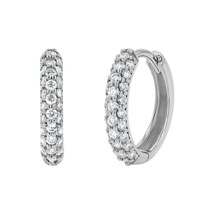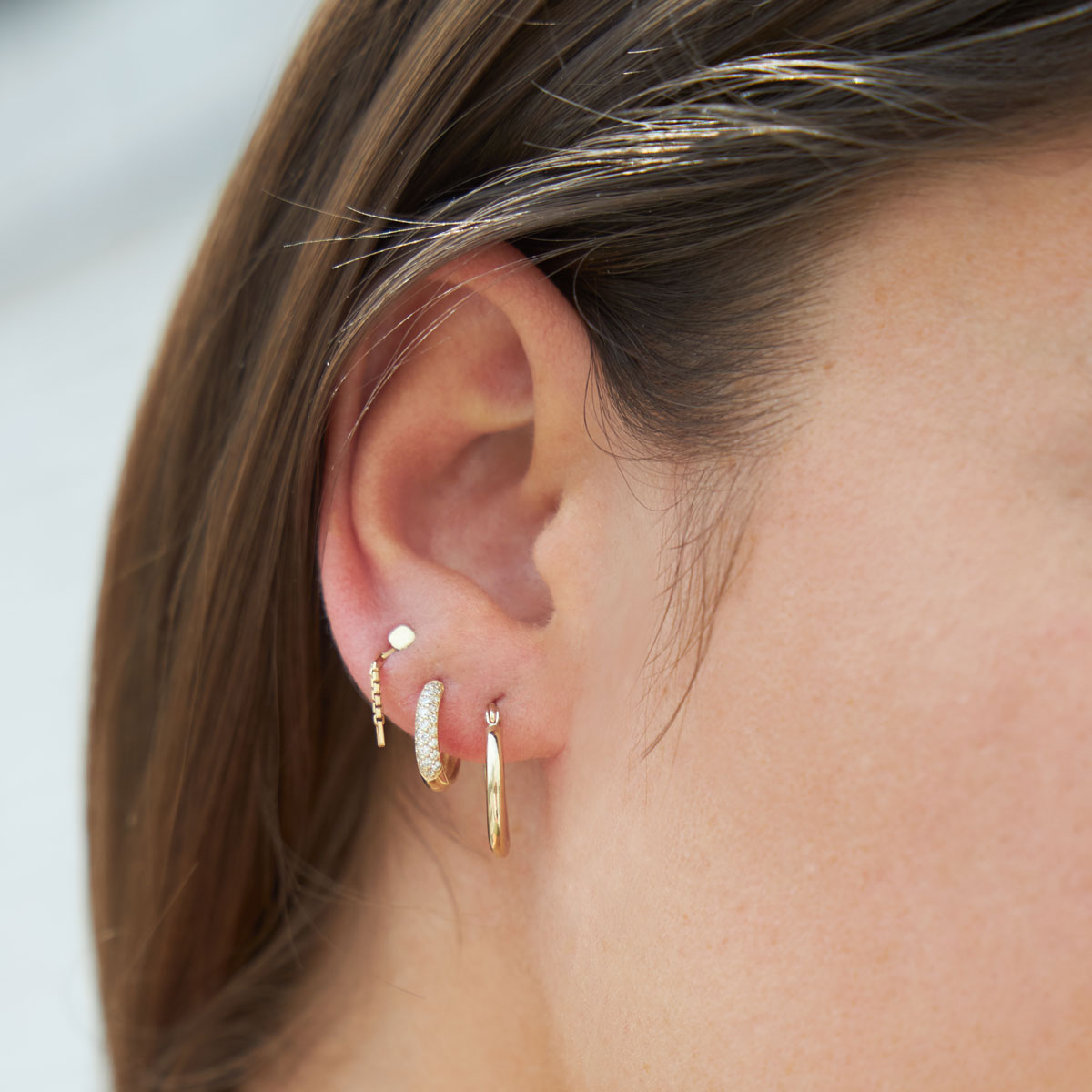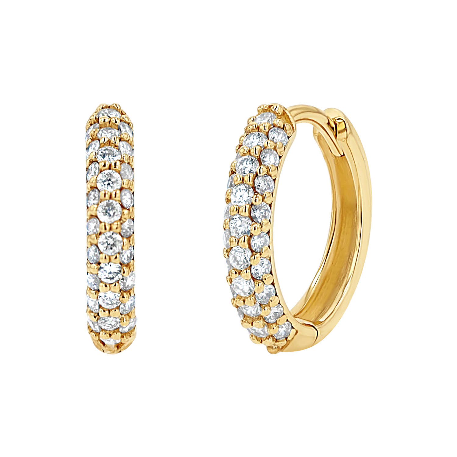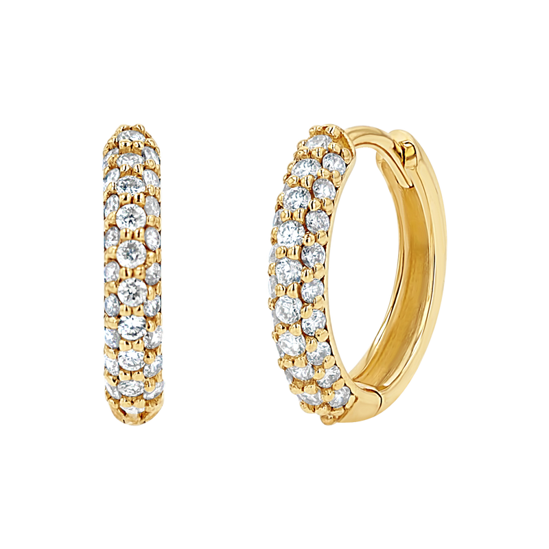 Our 14K Gold Amour Three Row Diamond Huggies are the Extra of all our huggies. Featuring 25 handset diamonds on each earring, these huggies are perfect to go day to night. They can be worn perfectly on your first piercing or layered up the ear. The perfect lightweight mechanism to sit securely on the ear without weighing it down. Flawlessly set in 14k solid gold, these bold diamond huggies won't make it off your ear.