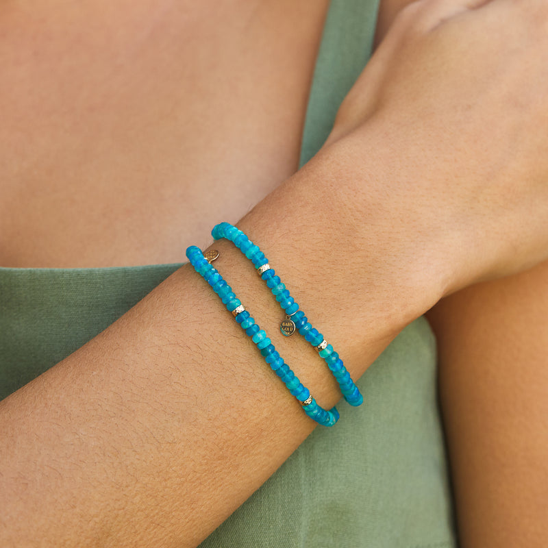 The perfect Summer bracelet stack is unlocked with the launch of our brand new  Paraiba Opal Stretch Bead Bracelet. These precious stones represent insight, creativity and wisdom. So easy to take off and on with it's stretchy slide on band. 14K Gold textured bead accents make this the perfect mix of beach to city chic. Layer with any of your favorite Babygold bracelets for a bold pop of blue!