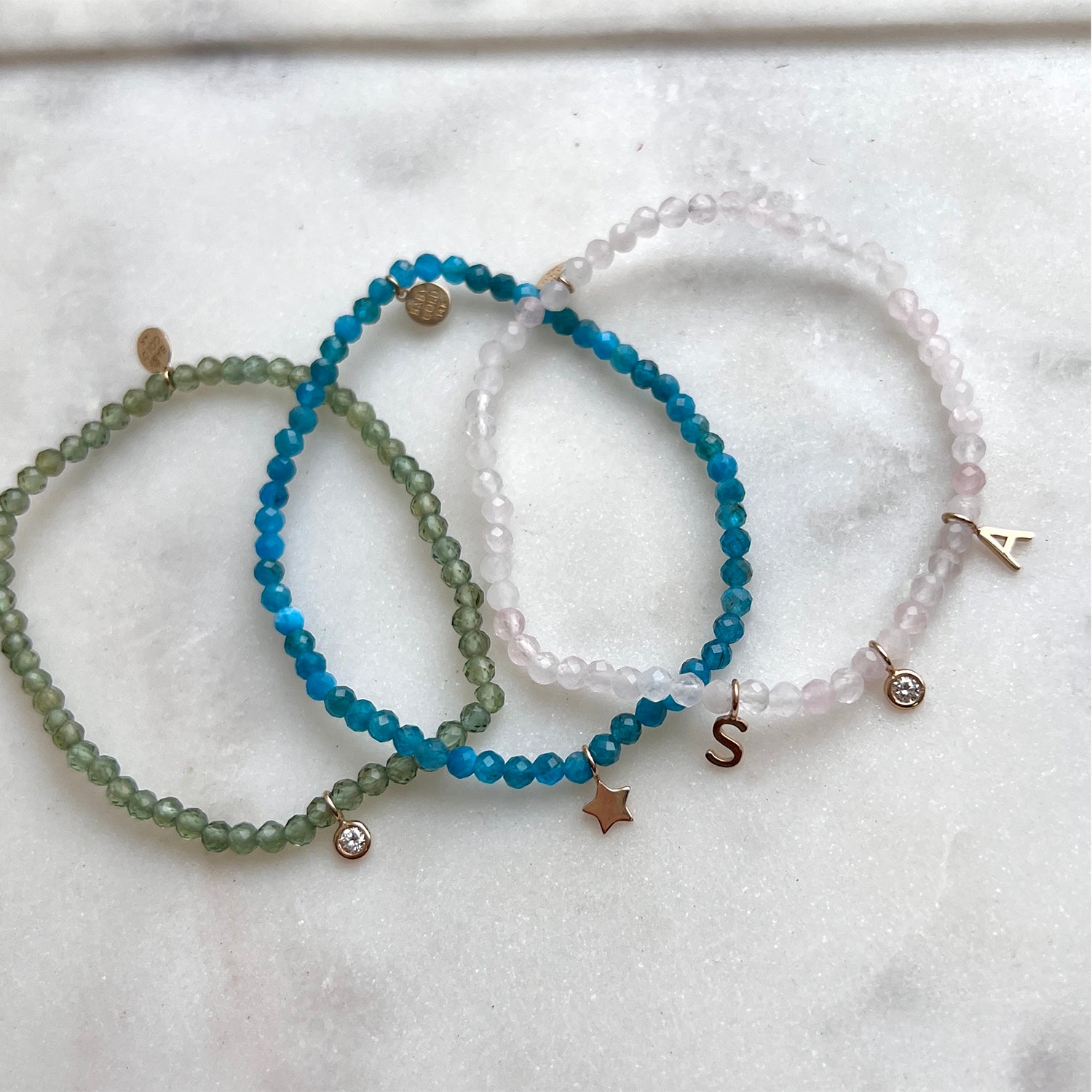 Introducing your new favorite way to add a playful and colorful twist to your stack, this beaded bracelet adds an element of fun and natural beauty! Customize and add on our best selling bezel set diamond, initials or celestial star charm. The perfect stretch off and on easy wear bracelet, year round style and forever pieces that are always 14K from Babygold!