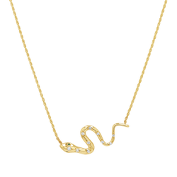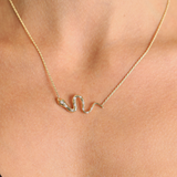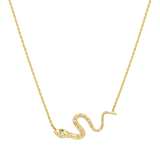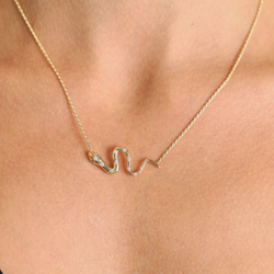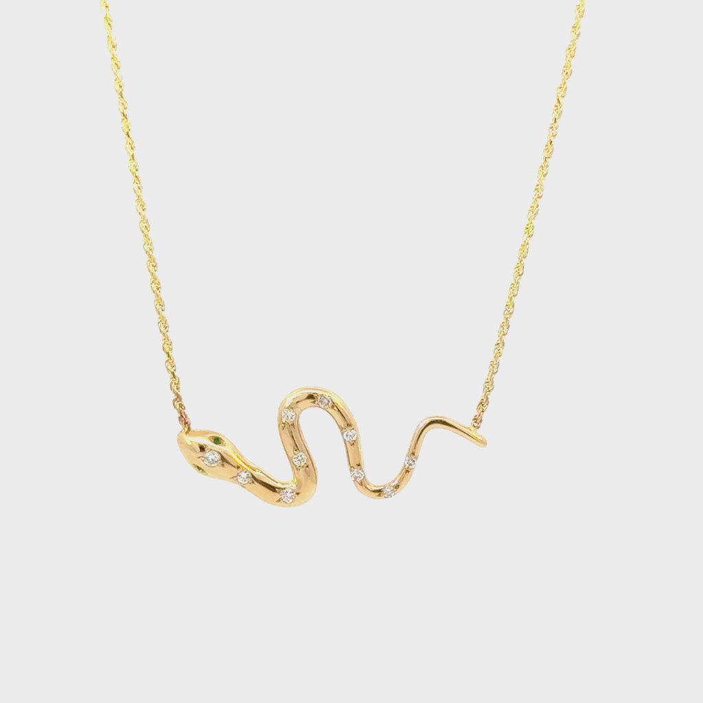 Introducing our Diamond Serpentine Necklace,  associated with wisdom and renewal, wearing your Diamond Serpentine Necklace will bring you a protection and remind you of your inner strengths each day. Speckled in diamonds, each graceful curve is topped with intricate detail, and the snake head with emerald accented eyes. This 14K Gold treasure will be a timeless heirloom for years to come. Pairs beautifully from the entire Serpentine Collection from Babygold!