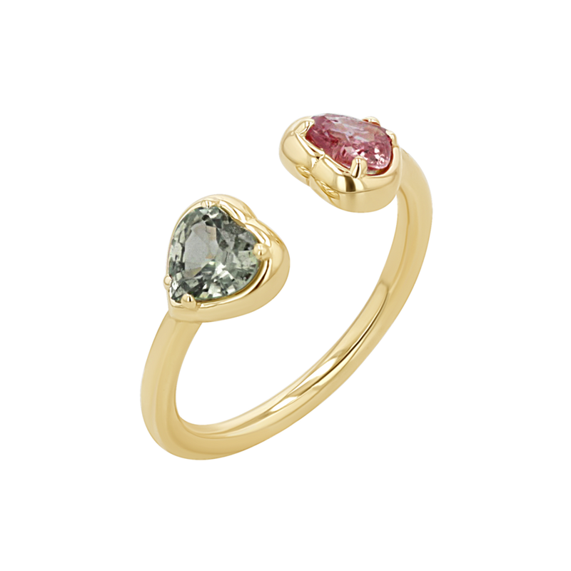 Introducing our Sapphire Heart Duo Wrap Ring featuring two captivating heart-cut natural Sapphires beautifully set in 14K Gold. A Blue/teal and Rose Sapphire color combination that present unparalleled sparkle and embody love in a modern and chic design. Wrapping this timeless piece around your finger will give your butterflies each time! Stack with your Babygold favorites for a stunning array of gold and shine!