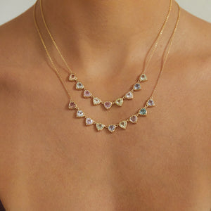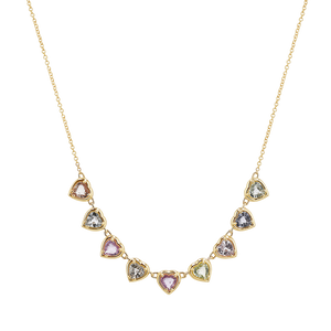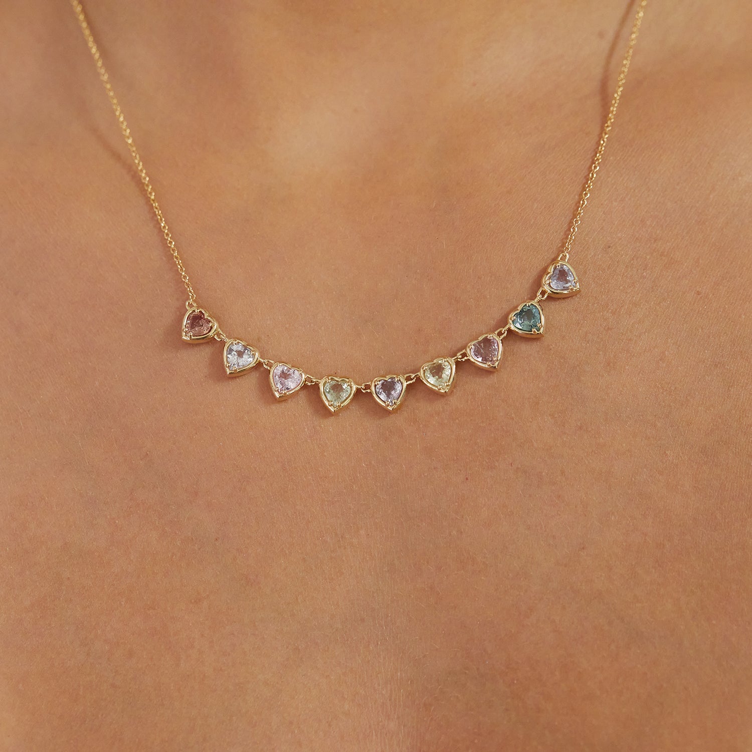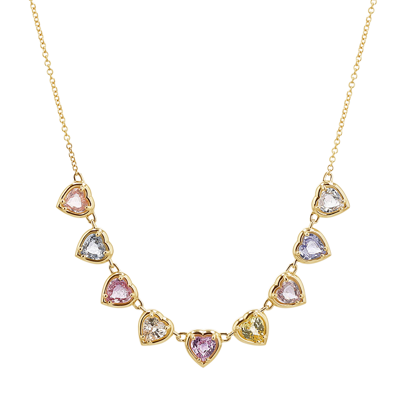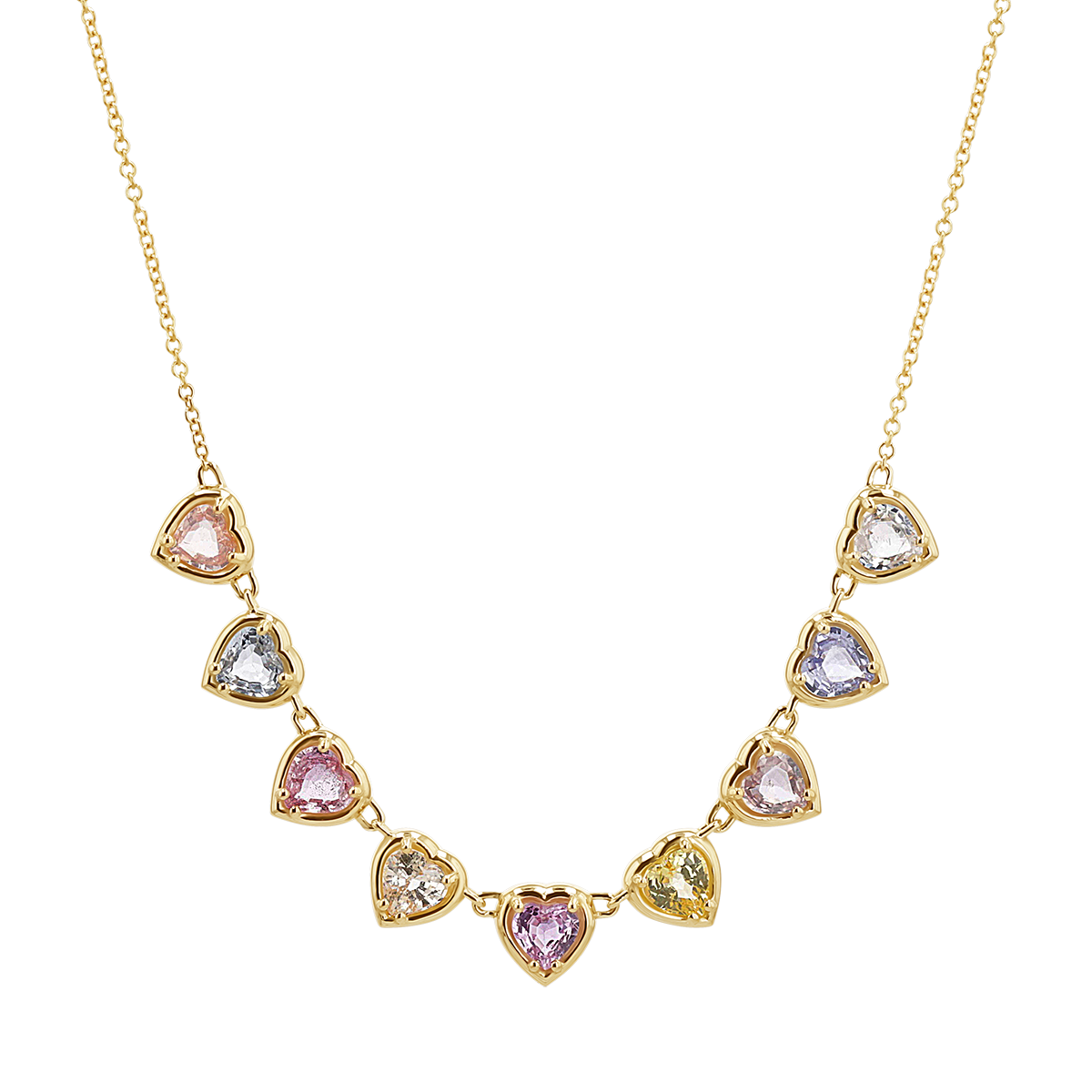 You will feel like a royal in this magnificently regal touch to your jewelry collection. A jaw dropping array of 9 heart cut sapphires. Hues ranging from Lilacs, Green, White and Blue strung along our best selling 14K Gold cable chain necklace. A Babygold curated color collection of the finest Sapphire gemstones and a powerful statement of love for yourself or someone dear.
