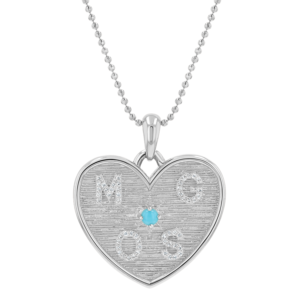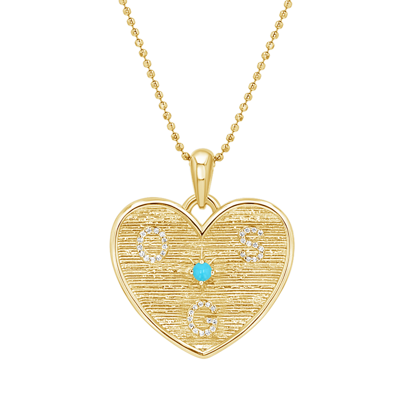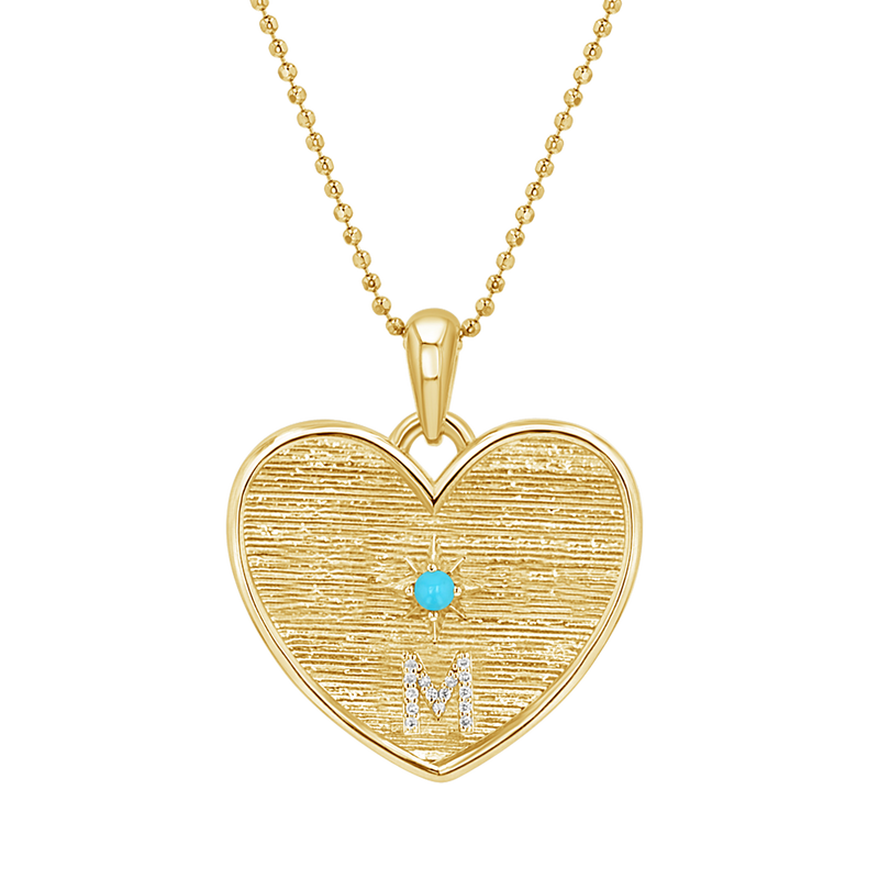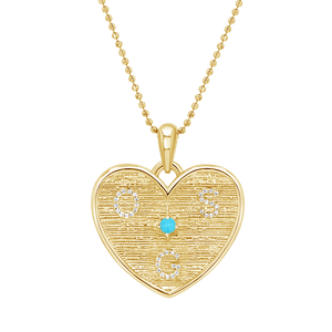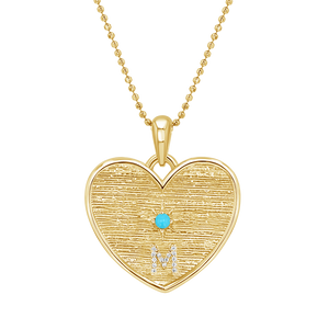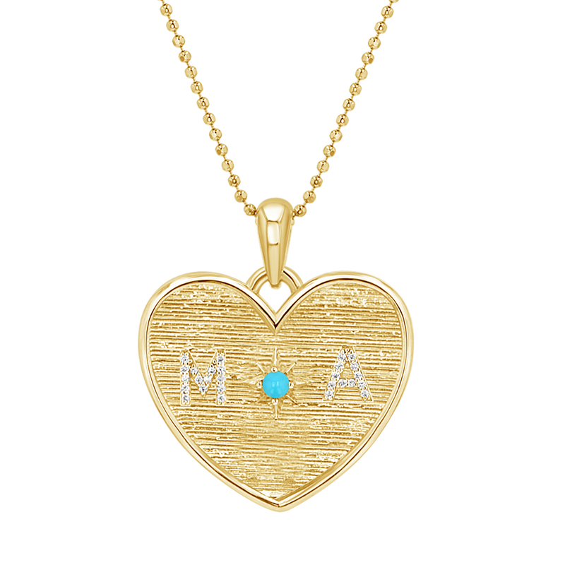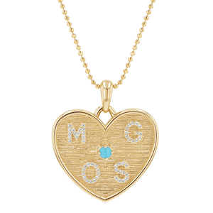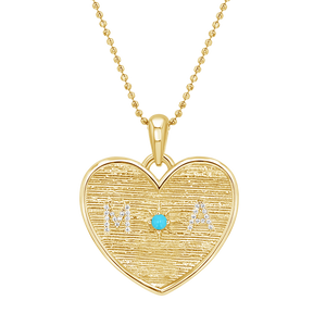 The Heart of Mine Necklace is the Holy Grail of all custom initial Medallions. Designed and created to bring a fully customizable piece to your collection. The Deco textured background creates the perfect canvas for the pop of turquoise. Available in solid or 1-4 initial options. Put all your loved ones on a Medallion and protect them with the healing powers of turquoise.