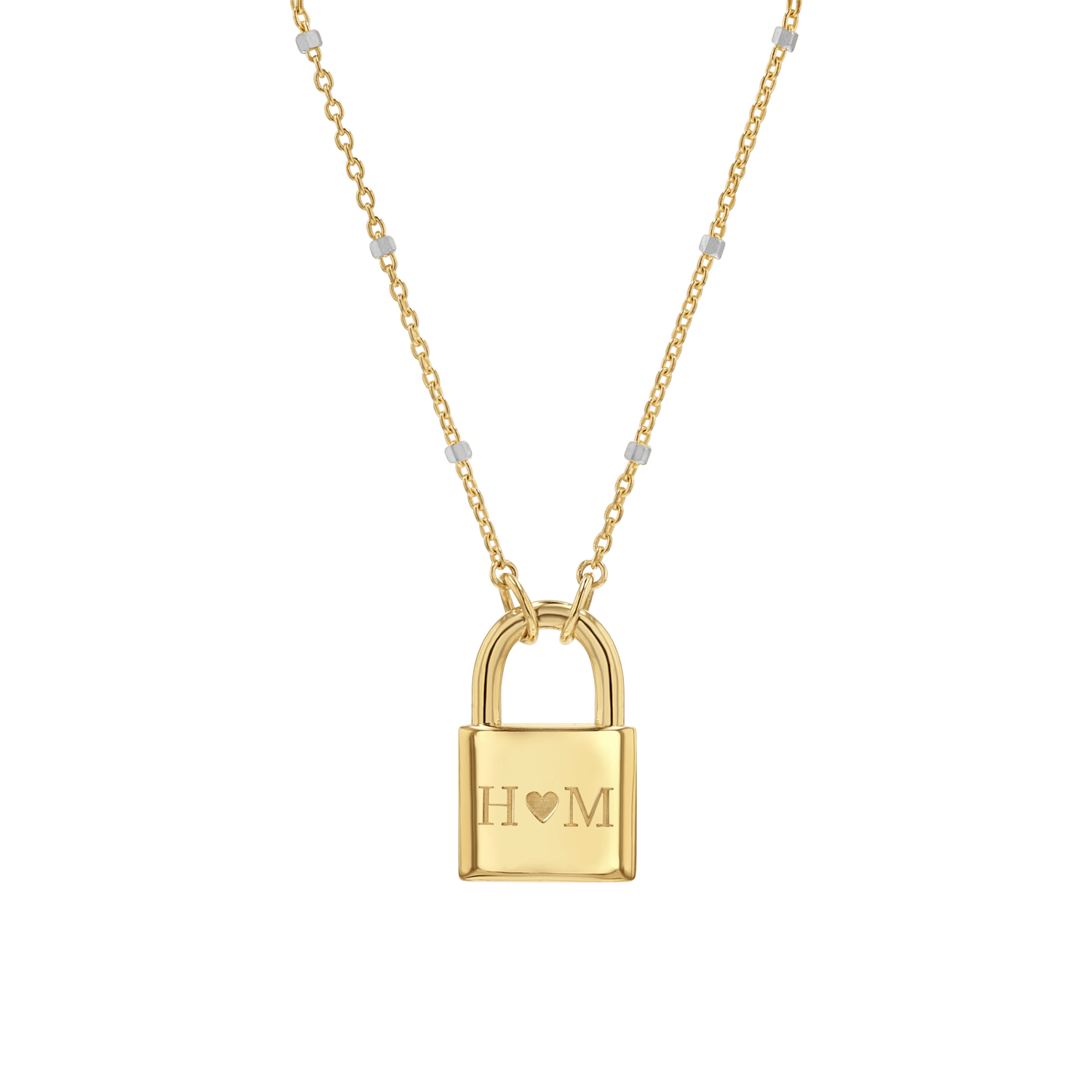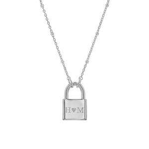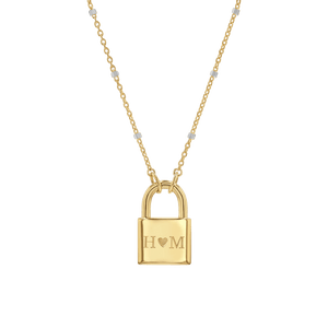 Lock in major style with this customizable Initial Padlock Sparkle Necklace. This beautiful piece is a reminder of love promised and the initials of people engraved will be forever locked and carried close to your heart.