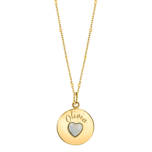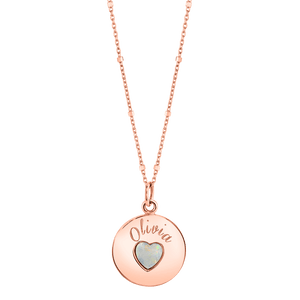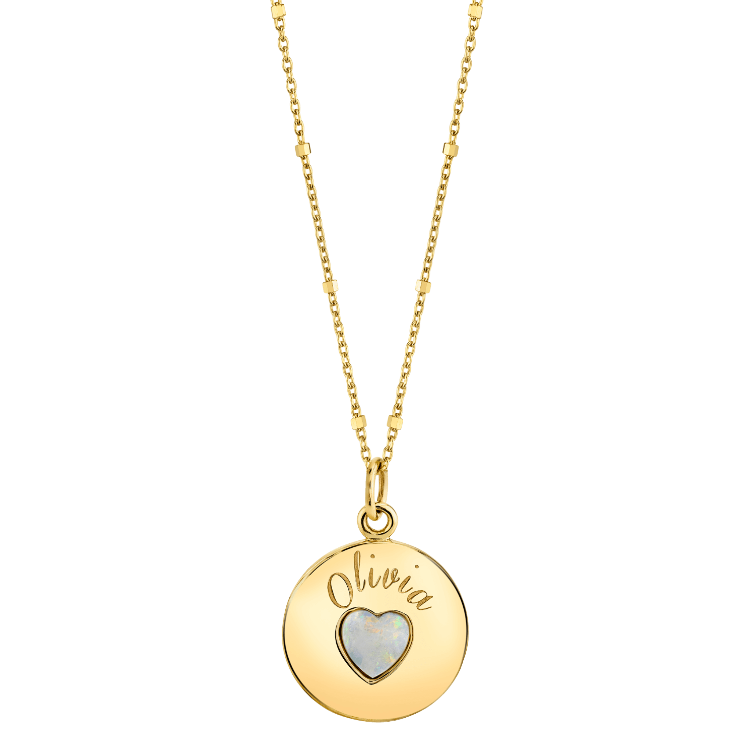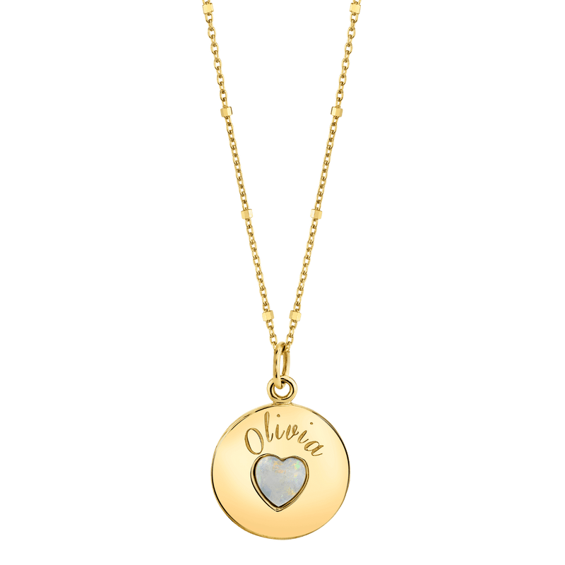 This 14K Grand Opal Heart Necklace is stunning and hangs on a sparkle chain. Can be personalized and has a natural Australian Opal perfectly hand carved into a heart in the middle. Wear it everyday and pair it with another of your favorite Baby Gold charms.