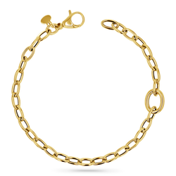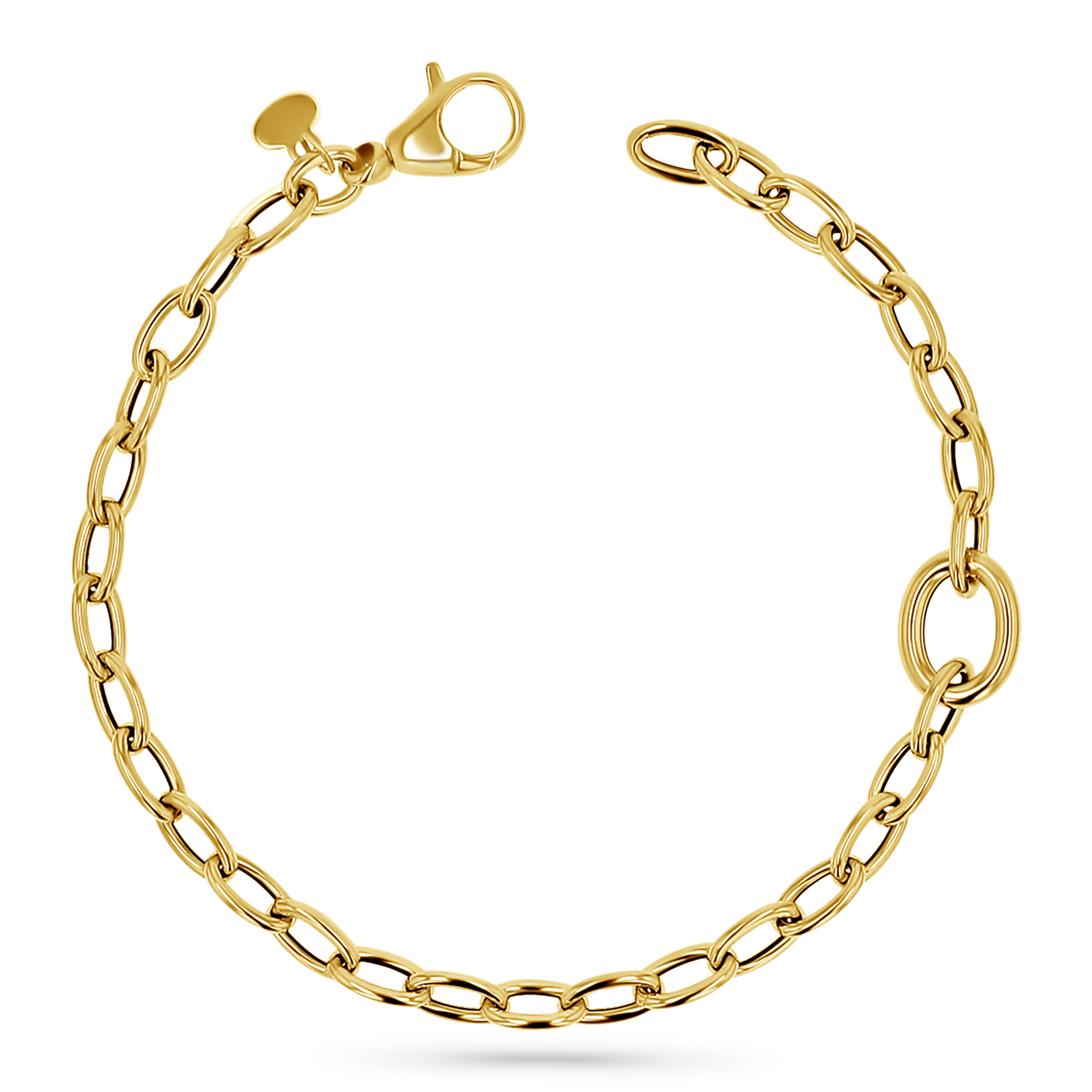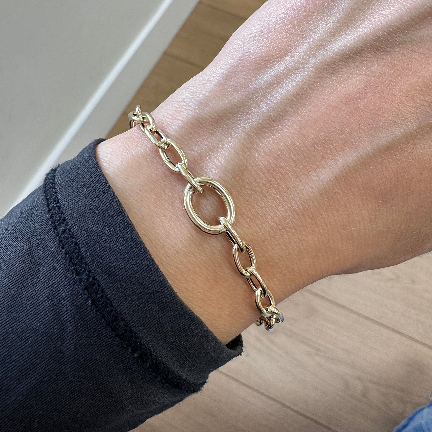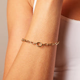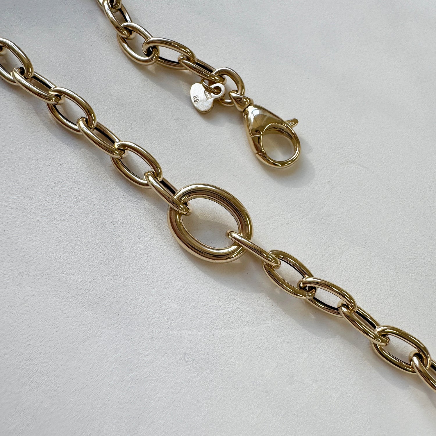 Crafted with sleek, elongated links and a bold circular loop our Yaris Chain Bracelet is the perfect foundation for your wrist stack. This bracelet is made for stacking, styling, and storytelling. Whether you keep it minimal or load it up with your favorite charms, it’s designed to shine with you through every moment. Striking enough to wear on its own, its lightweight yet sturdy.  Your signature piece, made personal.