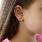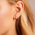 The handcrafted Baby Gold Shapes Collection Baguette Diamond Huggie Earrings are hand set with baguette cut diamonds. These stunning gold hoops are transformed with single uniquely cut .15ct diamonds. You won't ever want to take these off.