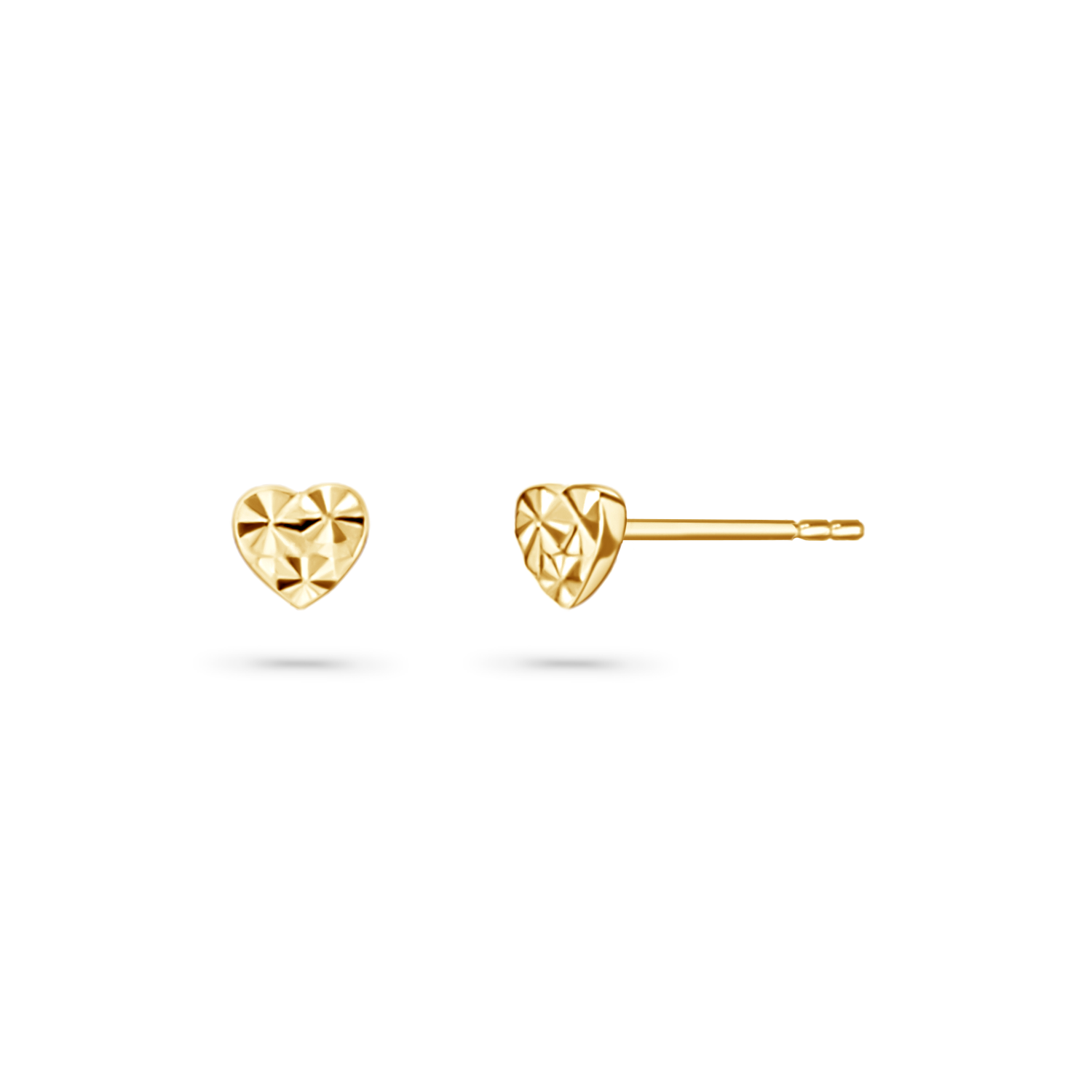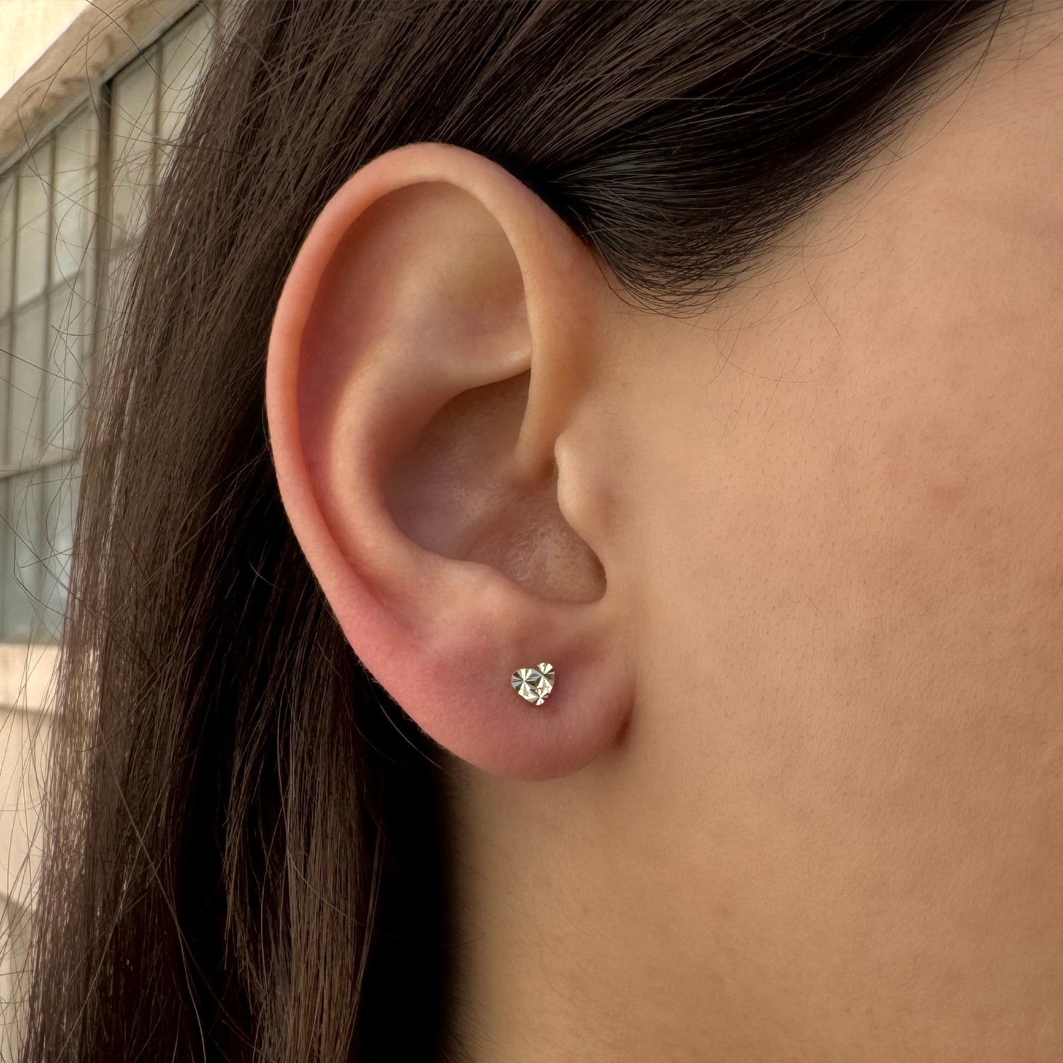 Add a touch of charm with our Mini Sparkle Heart Stud Earrings. Crafted from 14K solid gold, these delicate earrings feature a diamond cut shimmering heart design that captures the light with every movement. Their petite size makes them perfect for everyday wear, offering a subtle yet radiant touch of love to any look, whether worn alone for a hint of sparkle or paired with your favorite pieces.