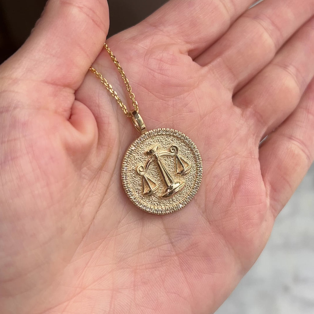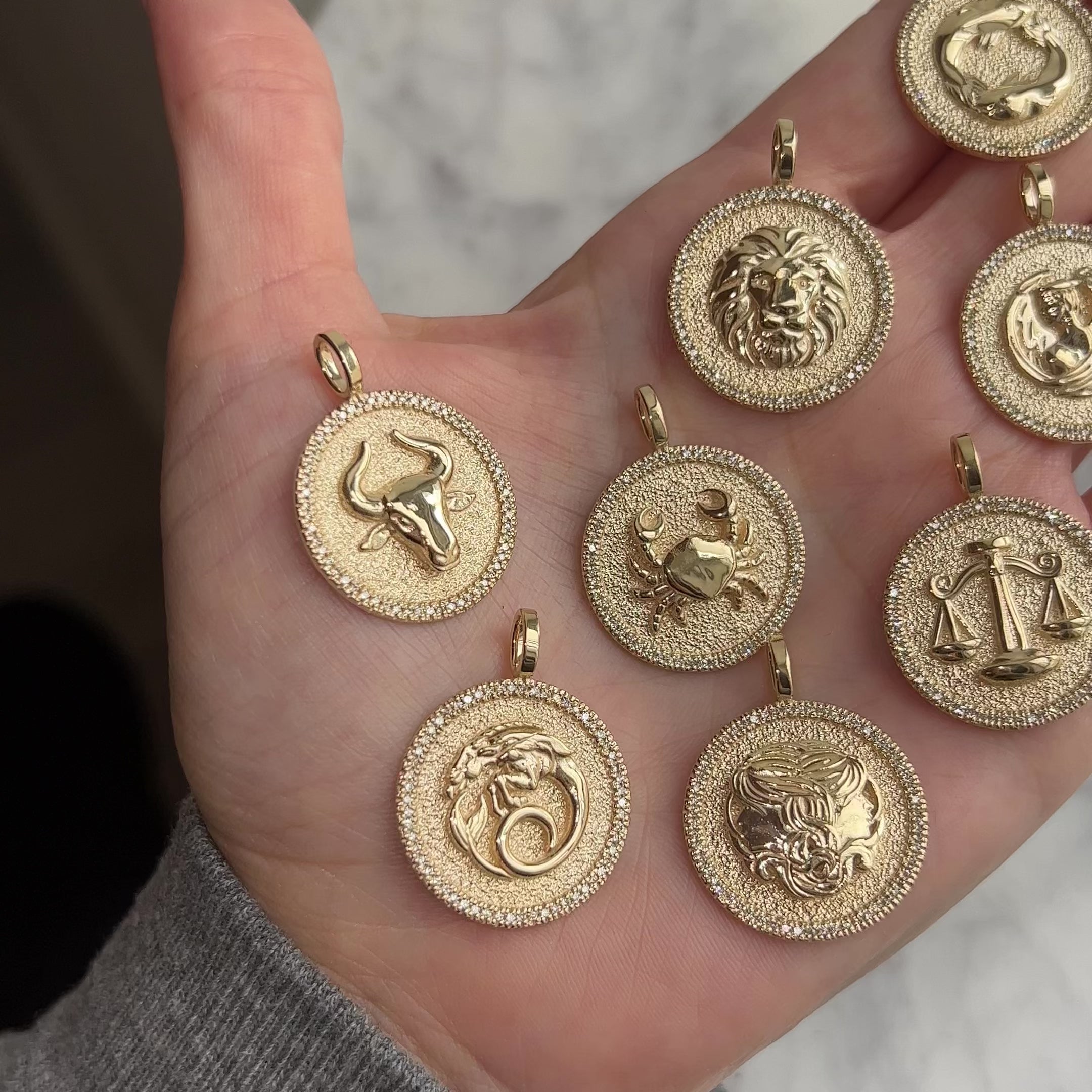 This sparkly and bold Zodiac Necklace is a stunning symbol of the sign that means most to you. Stunningly crafted in 14K Solid Gold, with a luxurious pave set diamond trim all around. This is the perfect centerpiece to complete your new favorite layer. Available in 3 gold colors and many chain length options.