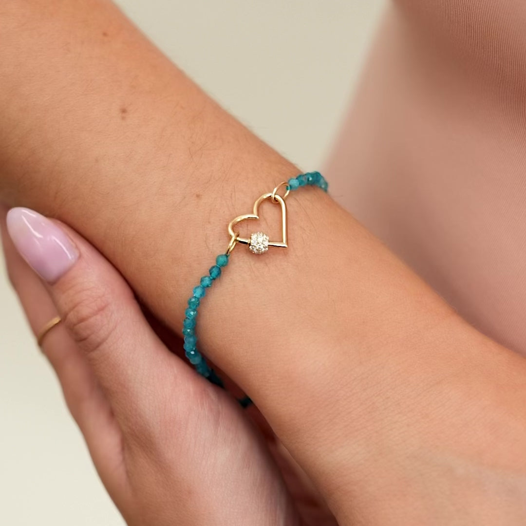 This bold pop of blue is your instant mood lifter. Our Apatite Connector Bracelet features vibrant faceted natural Apatite beads paired with 14K Gold oval connectors where you can insert your new favorite stackable charms. Designed to pair with one of our 14K Gold connectors and let your charm story or shine . Full of color, energy, and main character movement. Charm-ready & stack-approved.
