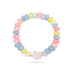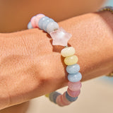 Candy-colored dreams, wrapped around your wrist. This stretch bracelet features chunky pastel morganite beads in soft pinks, blues, and yellows, finished with a glossy Rose Quartz star charm that steals the show. It’s playful, sweet, and made to stack. No rules, just vibes.