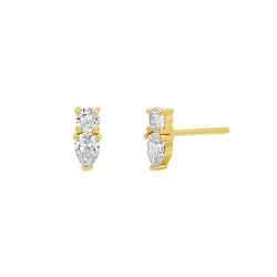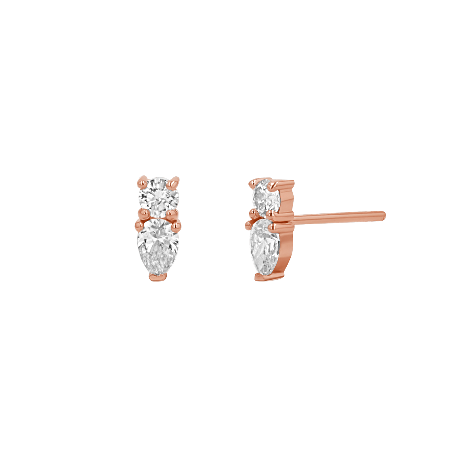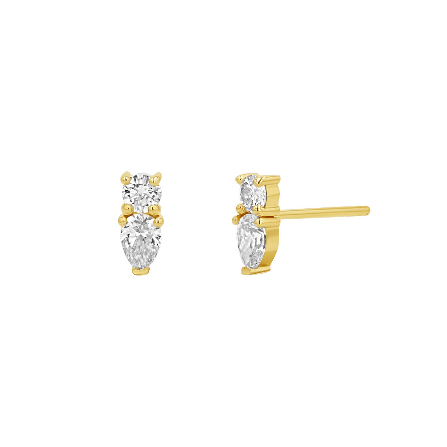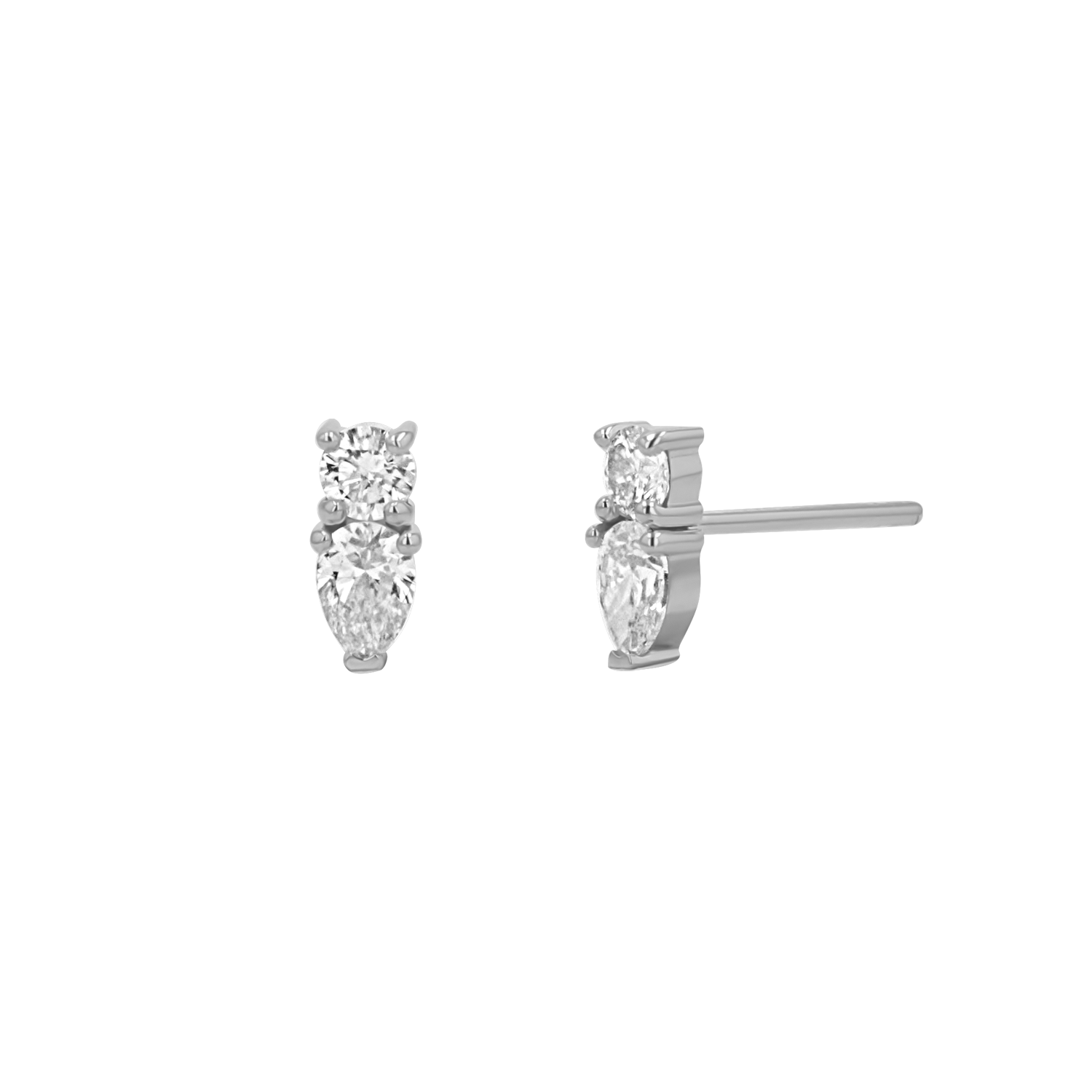 This perfect pair of diamonds marries a classic round brilliant cut solitaire with a fashionable pear. Each diamond is carefully selected for its exceptional clarity and brilliance, ensuring that these earrings sparkle endlessly with every move. A c harmonious balance of sophistication and charm that is perfect for adding a touch of glamour to any outfit. Perfect as a solo piece or stacked behind a chunky hoop for a trendy twist.
