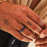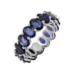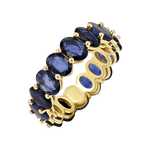 A timeless creation that will add unprecedented drama to those gorgeous hands. These Blue Sapphires will glimmer a striking silhouette. The seamless eternity band is has 6.50cts of natural brilliant blue sapphires. Handcrafted in 14K Solid Gold and hand set by our master stone setting team.  Not only will this ring add a bold pop of color to your jewelry box, but it is sure to be a prized heirloom for decades to come.