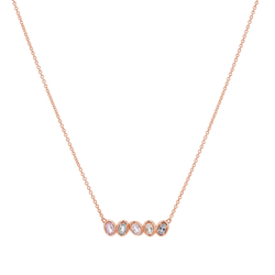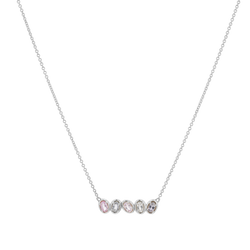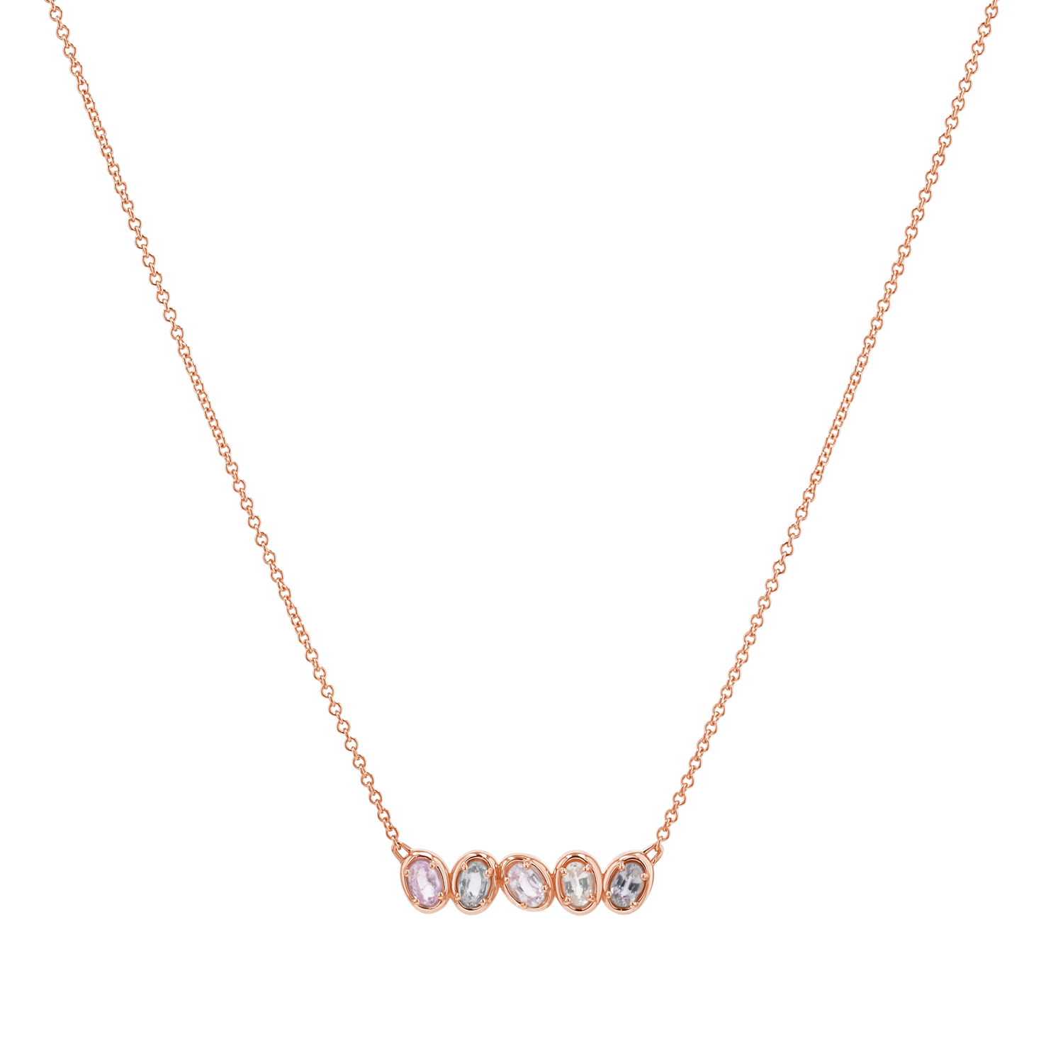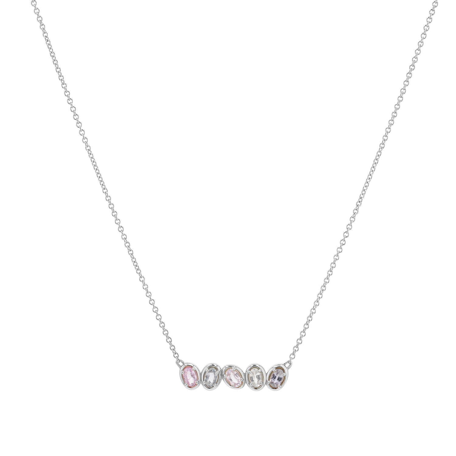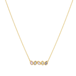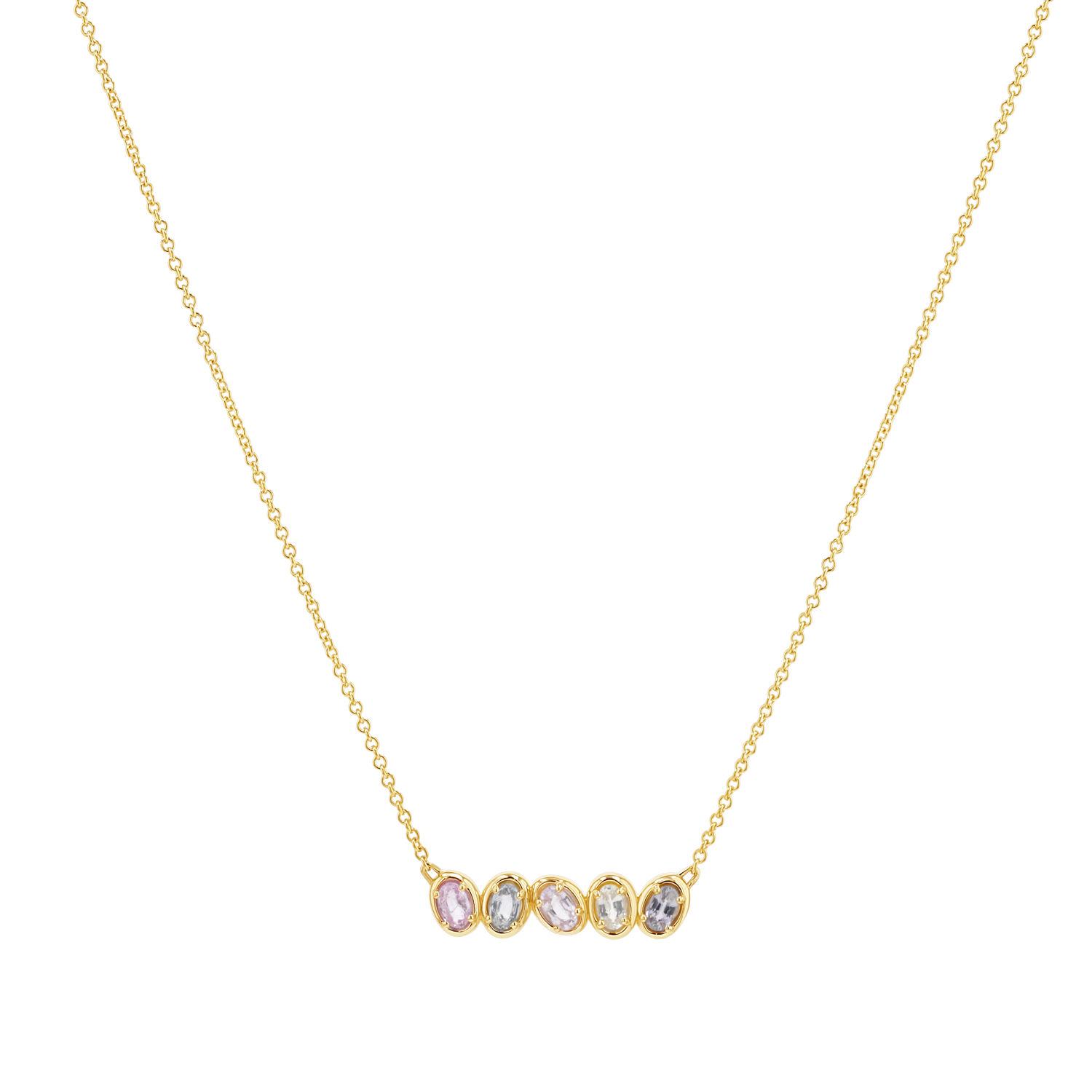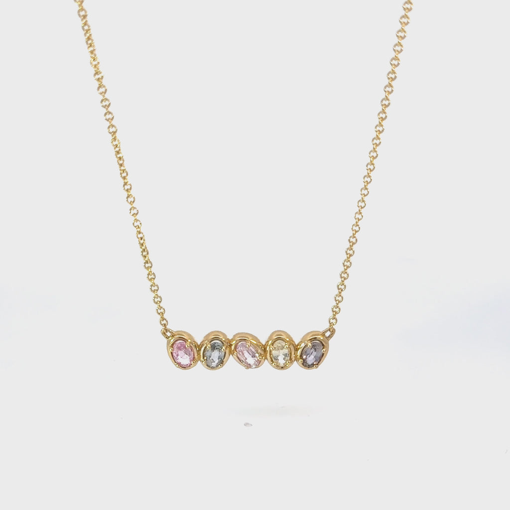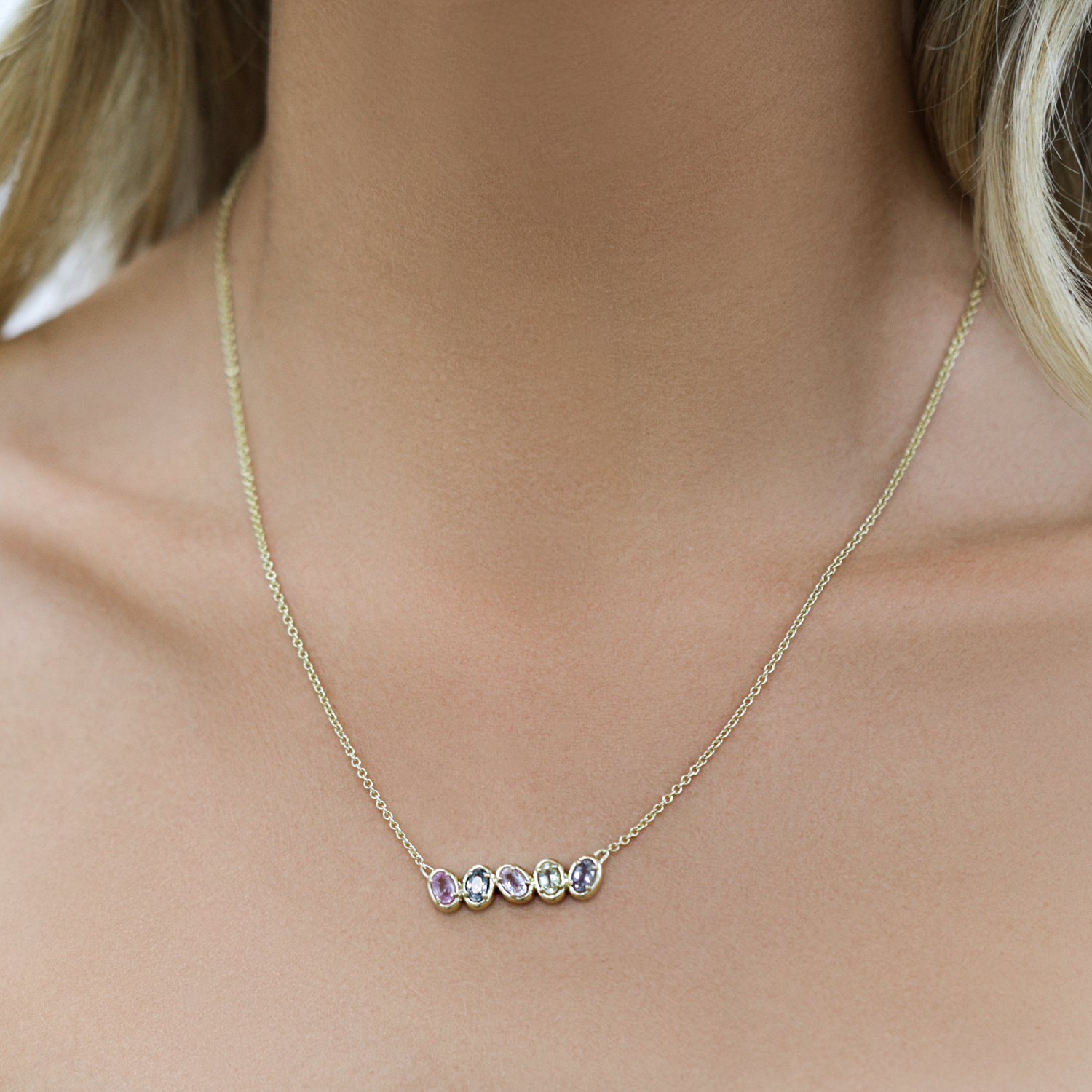 Meet our Sapphire Bar Chain Necklace. Crafted with charm and uniquely elegant, this stunning piece features five oval gemstones, each one shimmering with its unique pastel hued sapphire, set in a sleek 14K Gold chain. From soft pinks to cool blues, these gems are all about casual cool elegance. Add a perfect pop of color and sophistication to any outfit. Ideal for brunch dates, vacay trips, or just everyday chic.