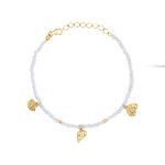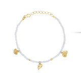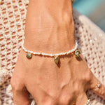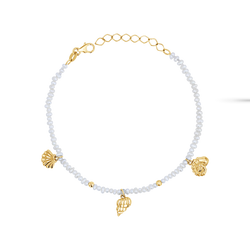 All the charm of a beach day, wrapped around your wrist. Our Seashell Charm Station Pearl Bracelet is hand-strung with dainty freshwater seed pearls and finished with a trio of golden ocean treasures, a scallop shell, spiral shell, and conch shell crafted in 14K Gold for that warm shimmer. It’s dainty, beachy, and made to move with you from sand to city.