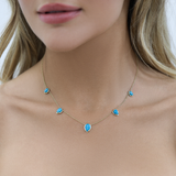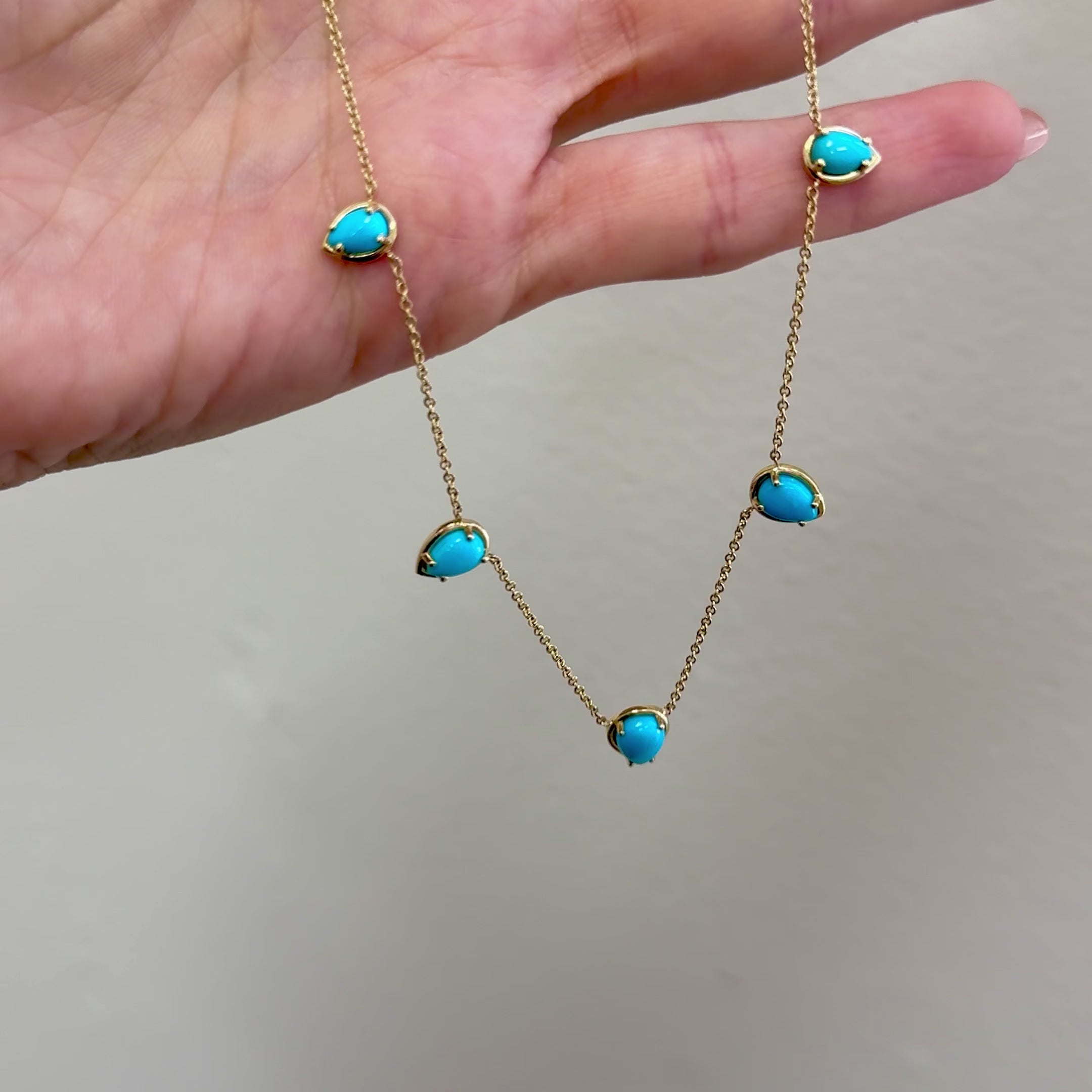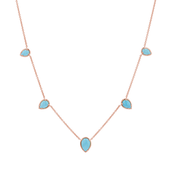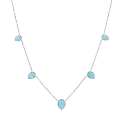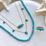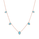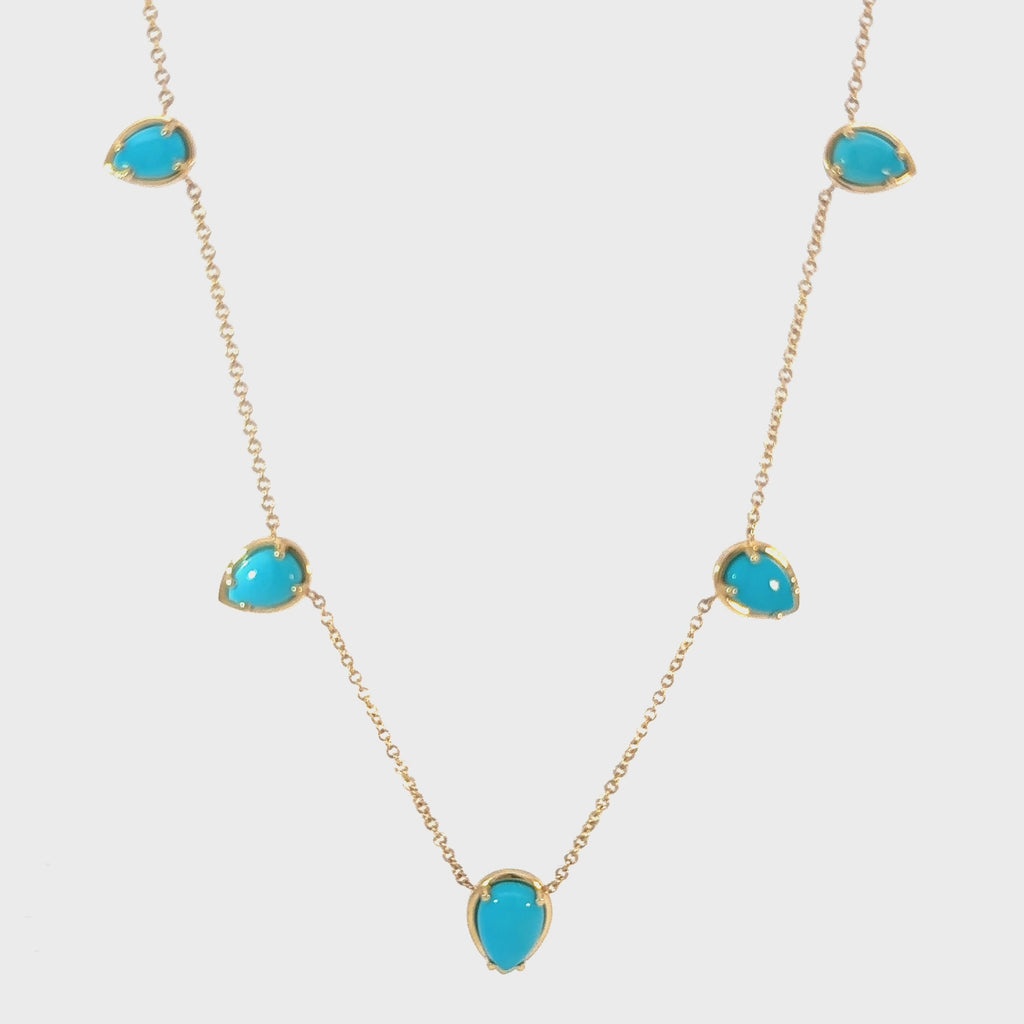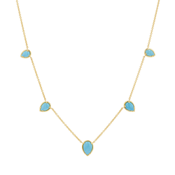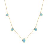 Be the essence of laid-back luxury in our Turquoise Tear Drop Necklace. This timeless piece with coastal charm will be your go-to accessory for any occasion. Featuring five polished teardrop-shaped turquoise stones, each one set in a radiant 14K gold frame and adorned on a classic cable chain that gracefully connects each stone, this necklace offers a look that's both modern and classic. It stacks perfectly with our Paper Clip or Herringbone chains!
