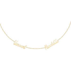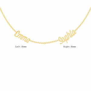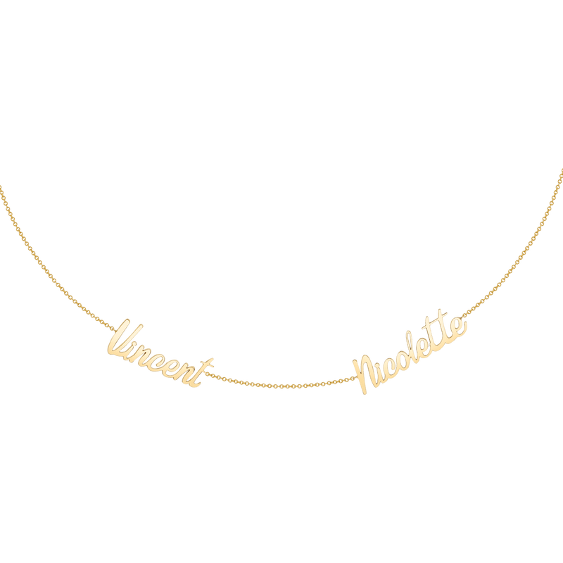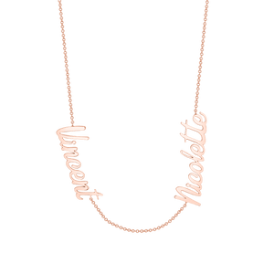 This 14K gold cursive custom two name necklace is a timeless piece you can wear everyday, and now you can add 2 names that mean the world to you. Show your love by wearing the names of the ones you cherish. Follow our position guide for placement details