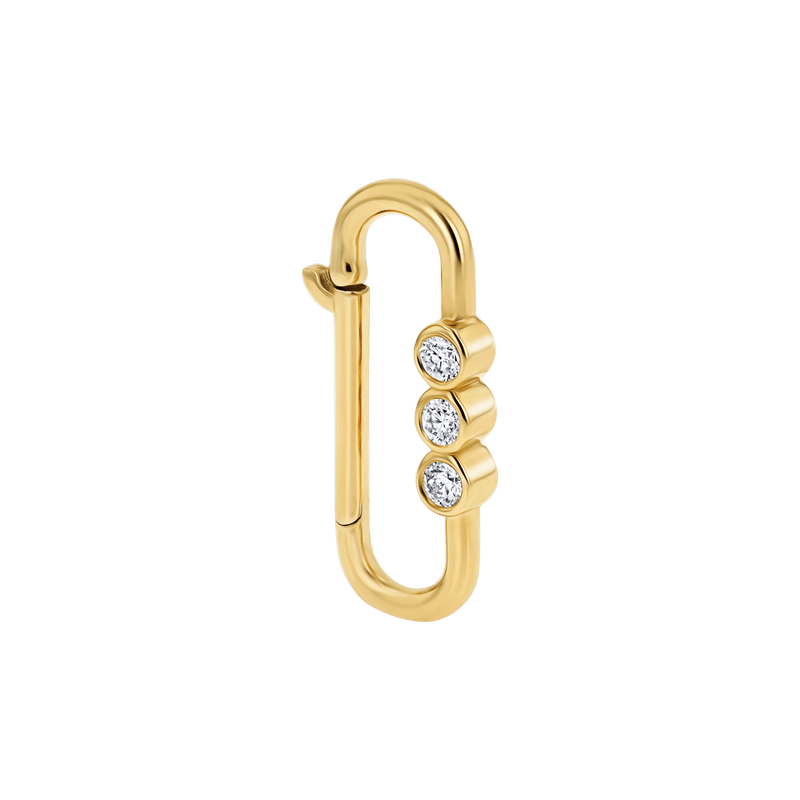 The ultimate accent to any charm or chain, this Tri-Bezel Diamond Paper Clip Connector might steal the show in your neck game.  Instantly elevate any charm or wear some for a modern minimal look. Three bezel set diamonds with 14k Gold clasp function.