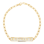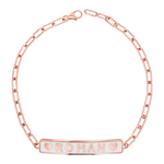 Our Custom Enamel ID Bracelet is the apogee of all customizable jewelry. A 14K solid gold nameplate latched onto a solid gold paper-clip link chain and laced with the text of your choice. It is available in 12 enamel color options, 3 gold colors, symbol options ( heart & star), and is customizable with your desired 8 character word. Our NEW enamel options are this years favorite pantone colorways and will definitely add some luxurious color to your style. The solid gold chain and lobster clasp closure have been added to make sure this new favorite piece will stay safely around your wrist. The best part? the links are adjustable and can be worn at various lengths.