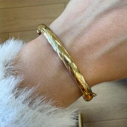Effortlessly chic with a touch of Parisian flair, the Puff Croissant Bangle brings a unique twist to your jewelry stack. Crafted in 14K gold, this bangle features a subtle, swirling pattern giving it an irresistible texture that catches the light beautifully. Its hinged clasp ensures easy wear while adding a refined detail that complements the overall design. Perfect for layering or as a stand-alone piece, this bangle exudes understated elegance and timeless charm. Designed for those who appreciate classic style with a modern twist, the Croissant Puff Bangle is a staple that elevates any look.