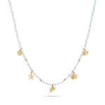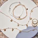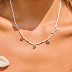 A beach day, but make it 14K. Our Seashell Charm Station Pearl Necklace features a hand-strung mix of mini freshwater pearls and is adorned with five 14K Gold shimmering sea life charms. Each charm individually cast and full of texture, giving your neckline that effortless, vacay energy. Lightweight, luxe, and ready for layering, this necklace brings major sun kissed sparkle to any summer stack.