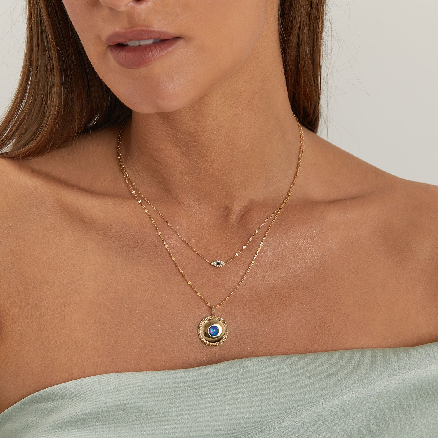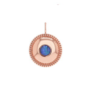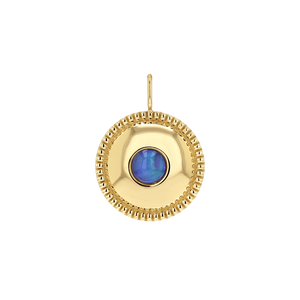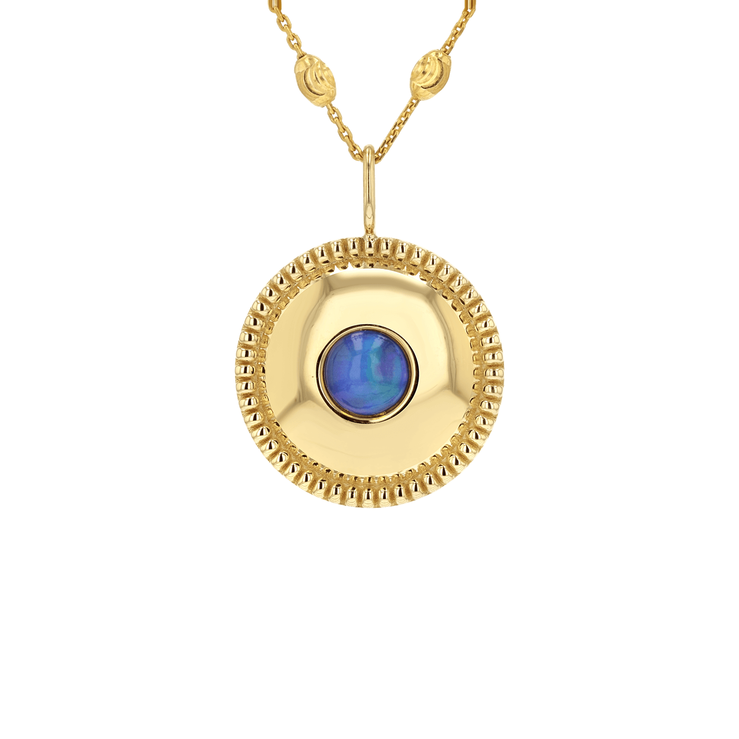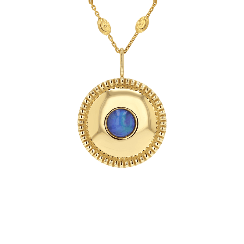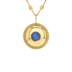 This stunning 14k gold beaded medallion is accented with a beautiful genuine opal stone. It is the statement heirloom piece you have been craving. Looks beautiful paired with our evil eye necklace or wear it alone for a solo dramatic affect. Shown on model paired with our Sequin Chain at 18."