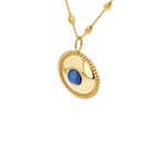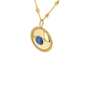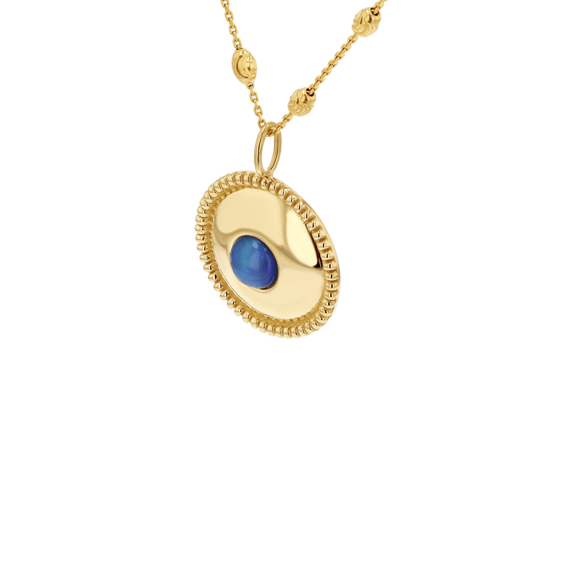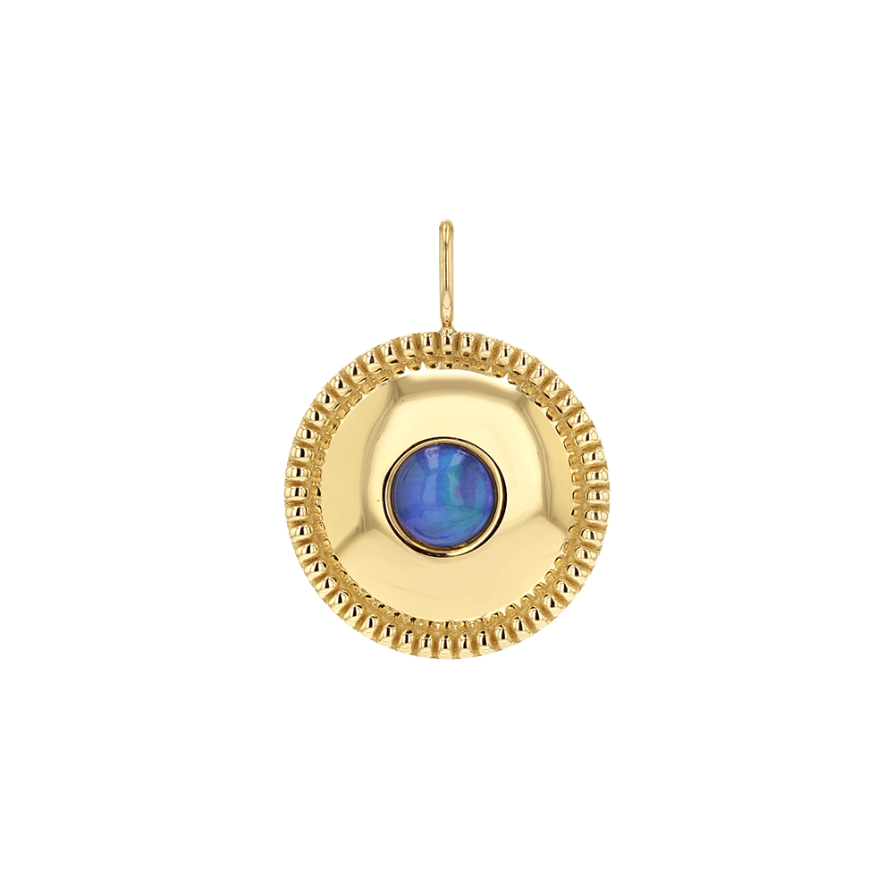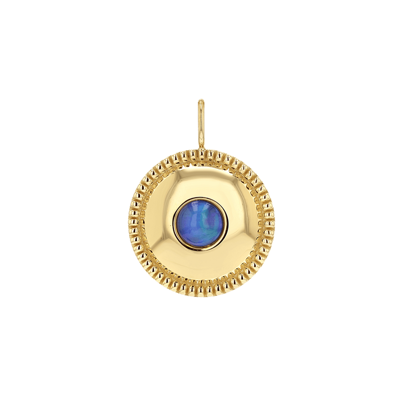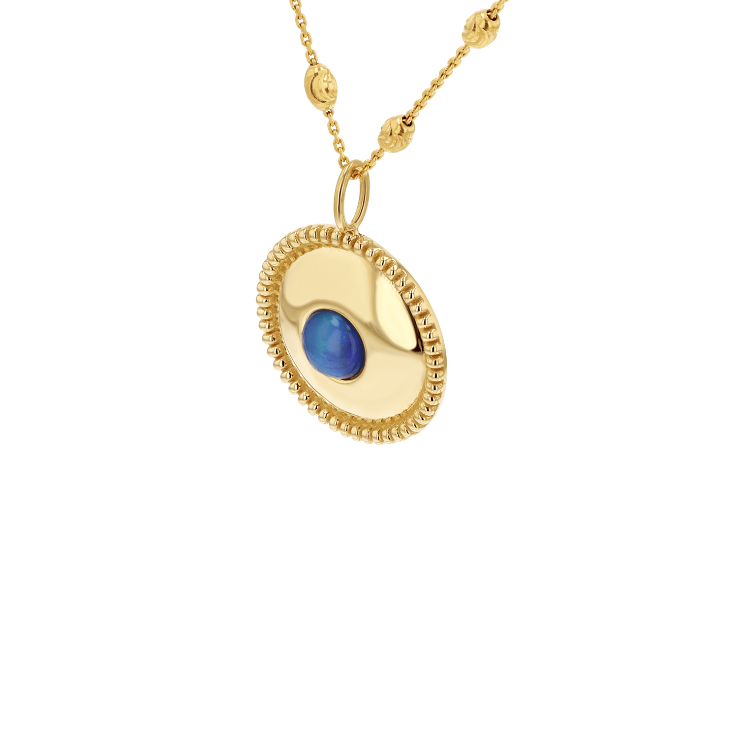 This stunning 14k gold beaded medallion is accented with a beautiful genuine opal stone. It is the statement heirloom piece you have been craving. Looks beautiful paired with our evil eye necklace or wear it alone for a solo dramatic affect. Shown on model paired with our Sequin Chain at 18."