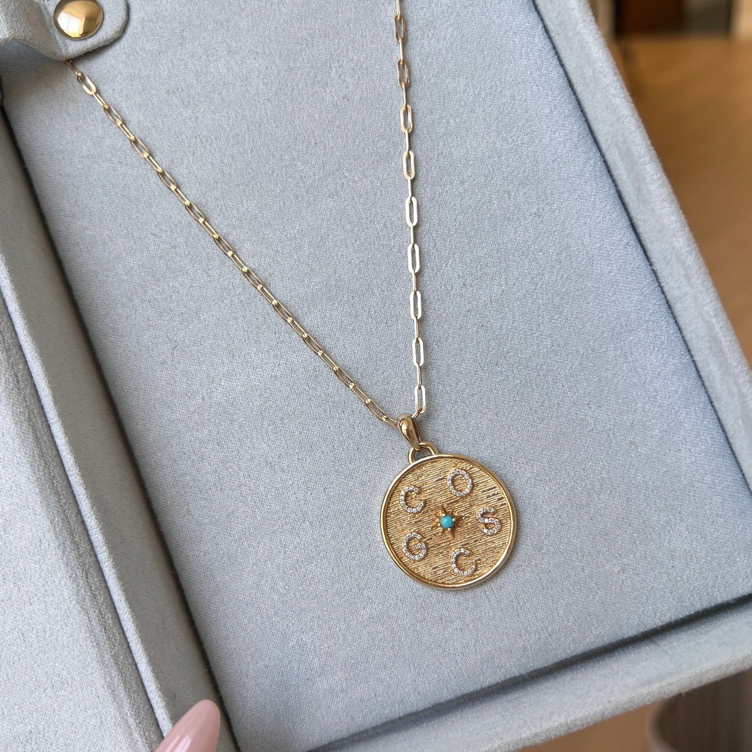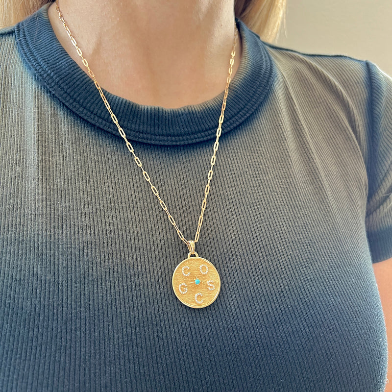 Our Circle of Life Diamond Multi Initial Charm is another lovely way of wearing your favorite initials close to your heart and this charm version allows you to choose your own Babygold chain. The Deco textured background creates the perfect canvas for the center pop of turquoise. Available in solid or 1-5 initial options. Put all your loved ones on a Medallion and guard them with the protective powers of turquoise.
