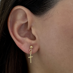 Meet your new go-to earrings with timeless appeal, the Classic Cross Drop Earrings. Perfectly sized and crafted in 14K Gold they feature a polished gold sphere stud and a delicate dangling cross. These protective earrings blend minimalist design with symbolic elegance. Perfect for everyday wear, our Classic Cross Drop Earrings earrings add a subtle yet meaningful touch to any look. Whether you’re stacking a statement up or keeping it minimal our Classic Cross Drop Earrings are a chic and versatile addition to your collection.