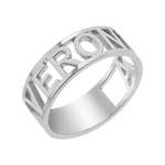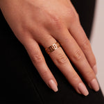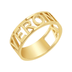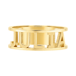 A minimal yet significant way to bring personalized pieces to your ring stack. Our Custom Name Band Ring is the name version of our Roman Numeral Ring. Made to order in 14K solid gold, this ring is 6.5mm wide. We suggest ordering half to full size larger for the best fit.
