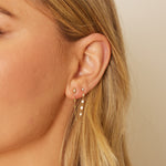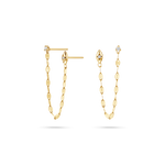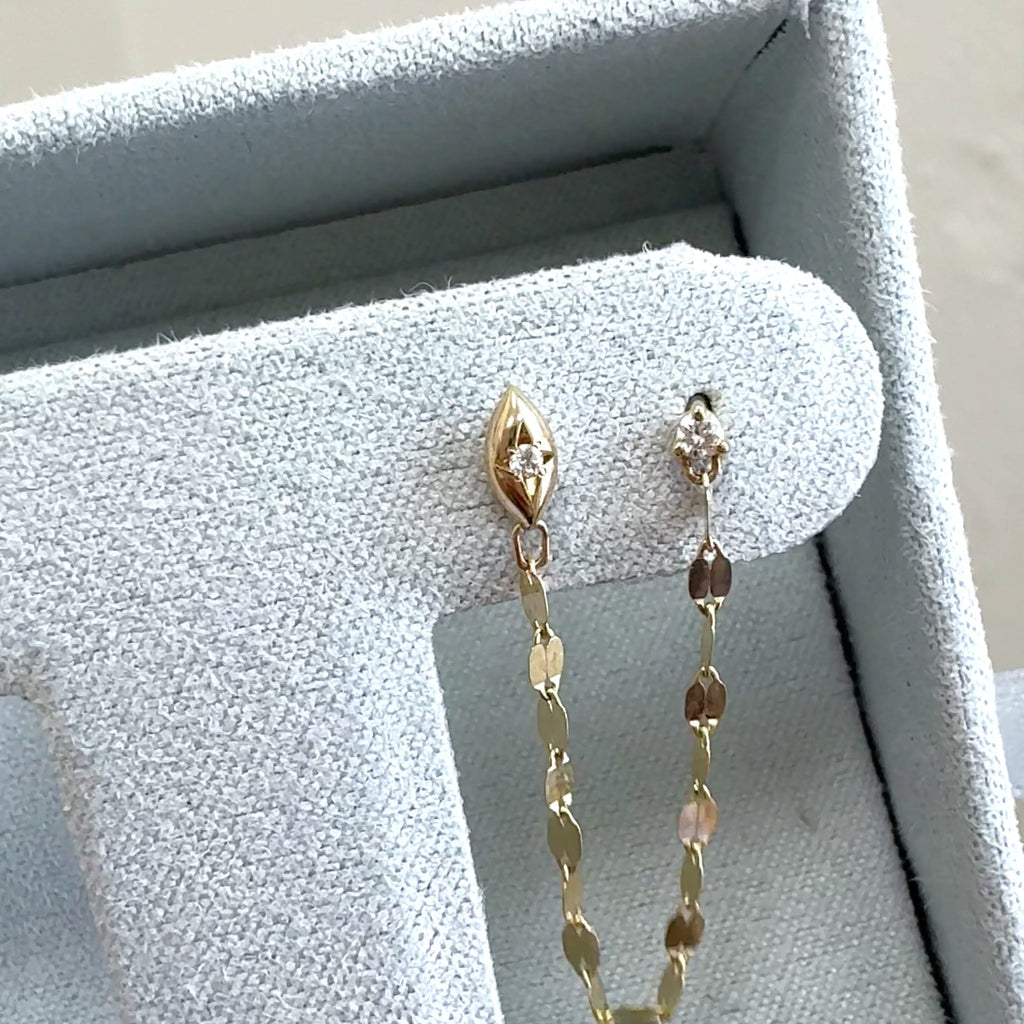 Our Demi Starset Duo Chain Earrings are crafted for those with two piercings who crave a touch of celestial shine. These earrings feature a delicate diamond on each stud and a demure 14K Gold chain that loops effortlessly between the two piercings, creating a sleek and modern curve link silhouette. Each stud is adorned with a subtle starset accent, offering just the right amount of sparkle to elevate your everyday style. Perfect for the girl who loves to mix minimalism with a bit of edge!