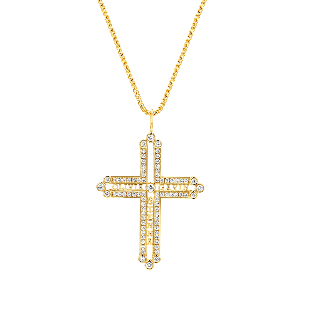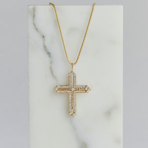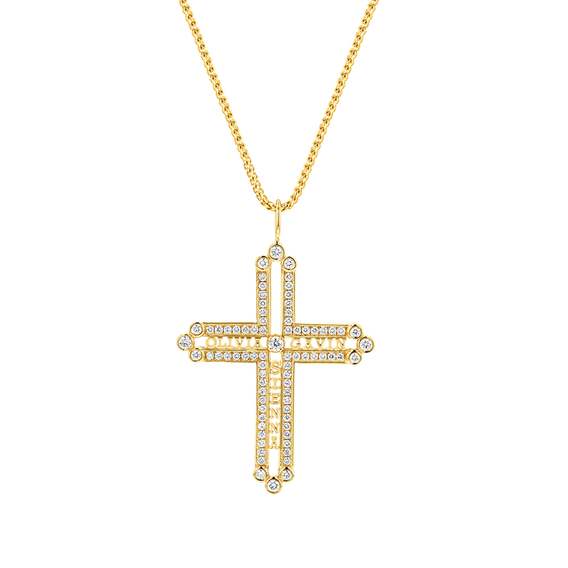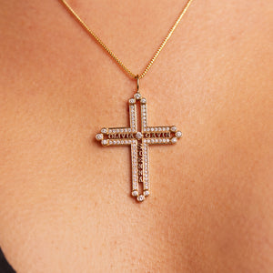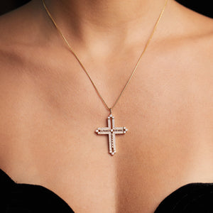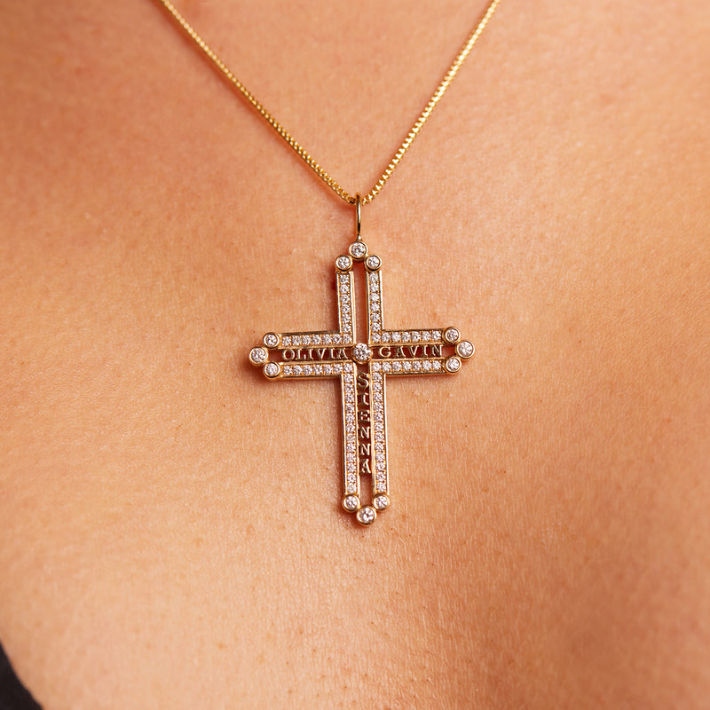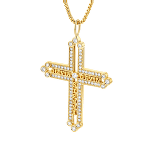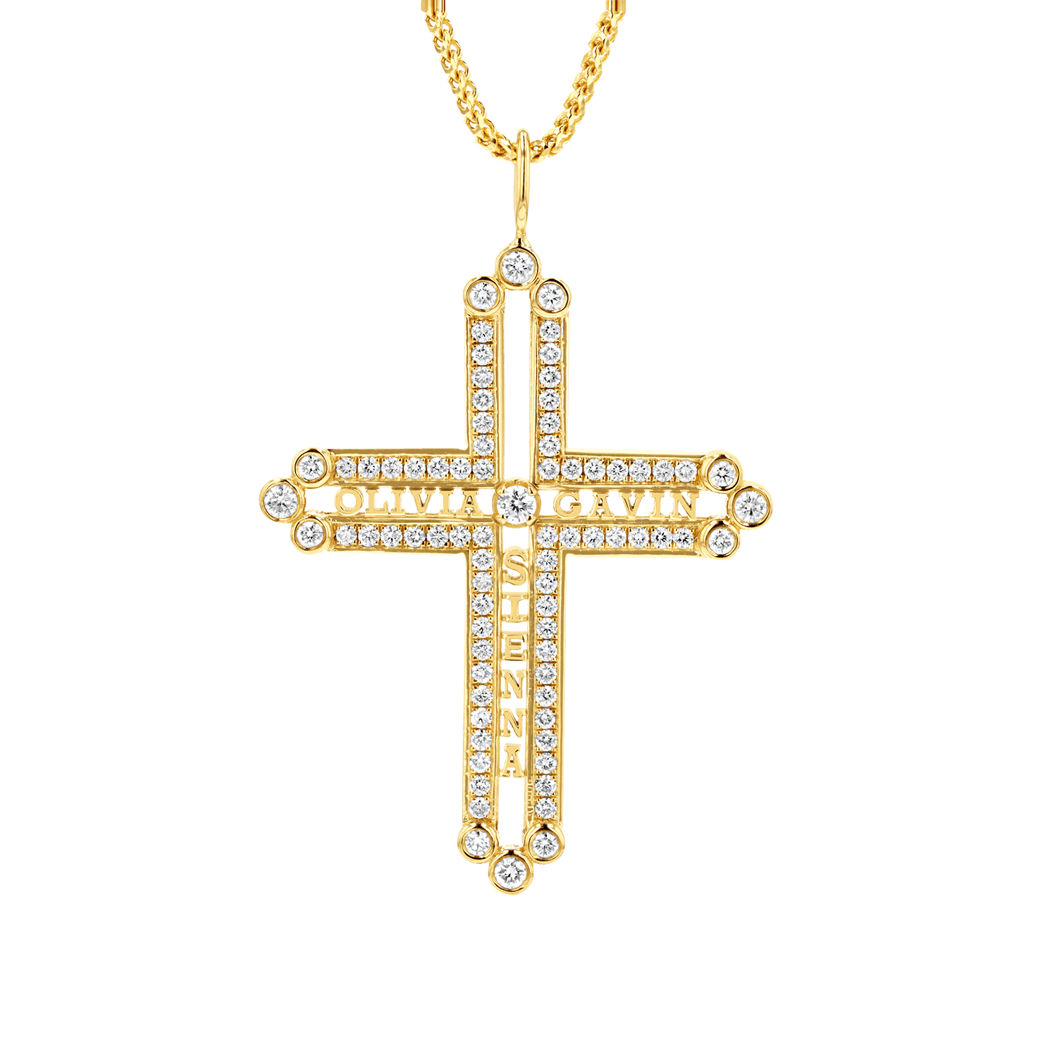 Edge to edge diamonds adorn this classic symbol of faith. Luxuriously accentuated with a trio of bezel set diamonds and a diamond center stone surrounded by a uniquely customizable cross. This special pendant will keep your faith close to your heart and is perfectly poised as a cherished heirloom piece to be passed down for generations.