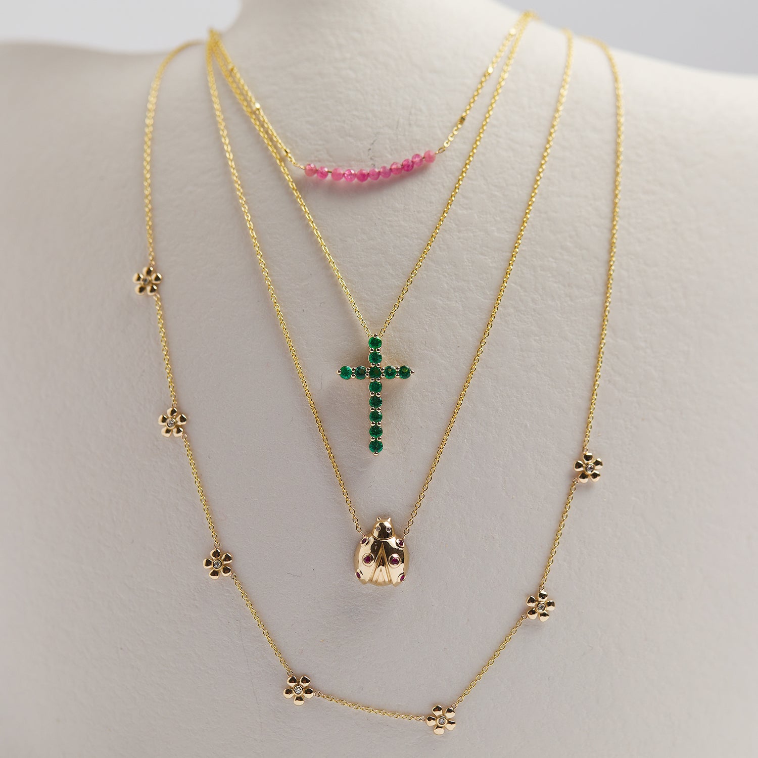 This modern and luxurious Emerald Cross necklace is handset in 14K Solid Gold with vibrant mm natural Emeralds. The Cross brings hope and faith to many. Wear it as a reminder of strength and love.
