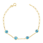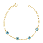 The perfect combination of style and protection, this Multi Enamel Evil Eye Paper Clip Bracelet combines paper clip and cable chain in one.  The paper clip chain allows for adjustable links depending on if you want to wear it tighter or loose around your wrist. Available in 14K yellow gold and 2 enamel color options. A piece that will be treasured for years to come, it effortlessly adds playful style to your wrist while casting negative vibes away!