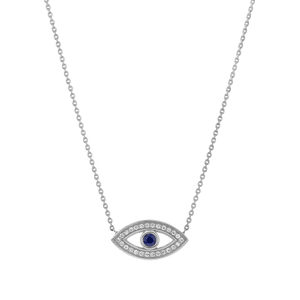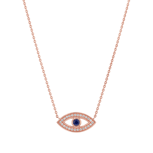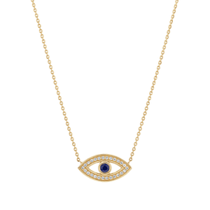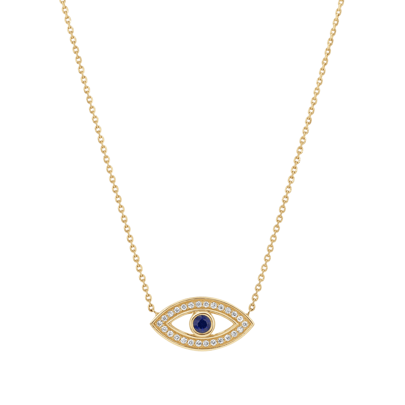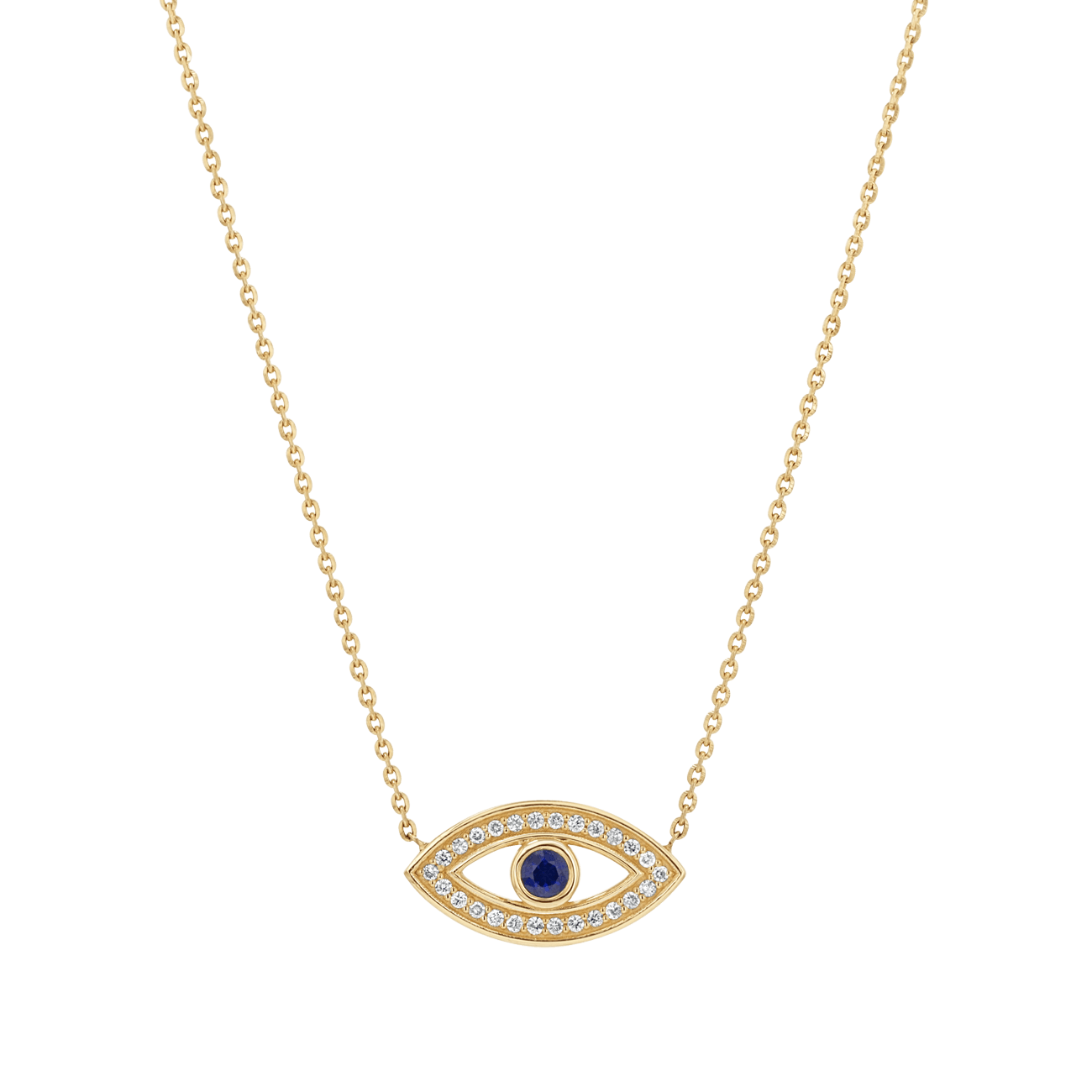 Introducing your favorite new evil eye necklace! This diamond pave sparkling beauty is expertly crafted and timeless in it's allure. The stunning blue sapphire center stone is not only eye catching, but essential in warding off the bad spirits to keep your energy as vibrant as you are. Bring on the high vibrations with this heirloom worthy piece!