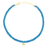 Introducing our Evil Eye Gemstone Anklet, a meaningful piece that combines vibrant color with protective symbolism, exclusively from Babygold. This anklet features a strand of striking Neon Opal blue beads, meticulously chosen for their rich hue. At the center hangs a delicate 14K gold evil eye charm, symbolizing protection and positive energy. Crafted with precision, the anklet offers an adjustable gold clasp, ensuring a perfect fit and making it a versatile accessory that is both chic and meaningful.