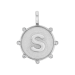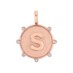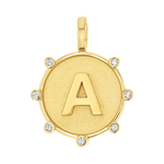 Our popular Bubble medallion is now available in customizable initials. Uppercase letters A-Z are available on this beautiful medallion. Measuring at about 20mm round bordered with 7 lucky bezel set diamonds, this piece is sure to be your new favorite charm. where it alone or layer on a few together.