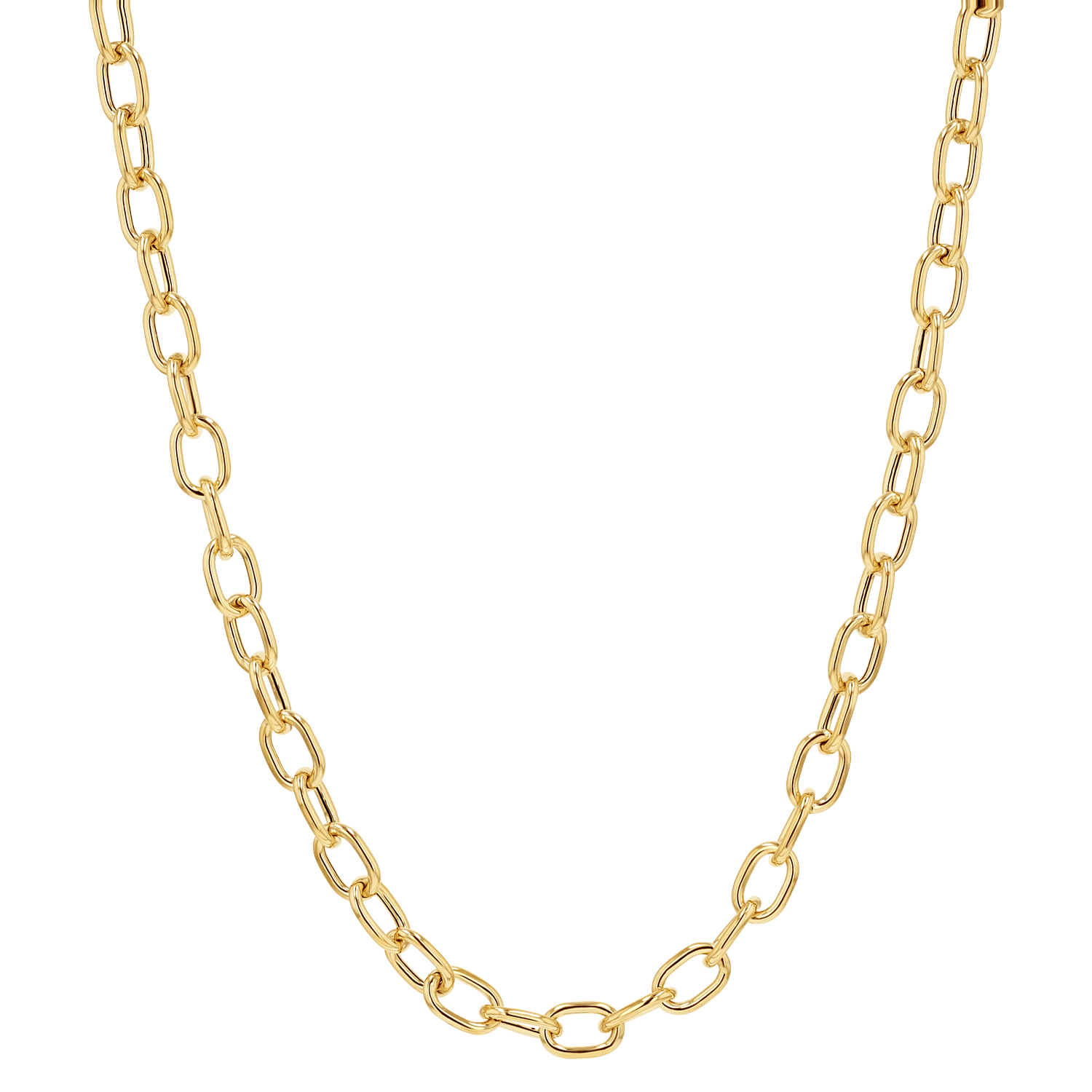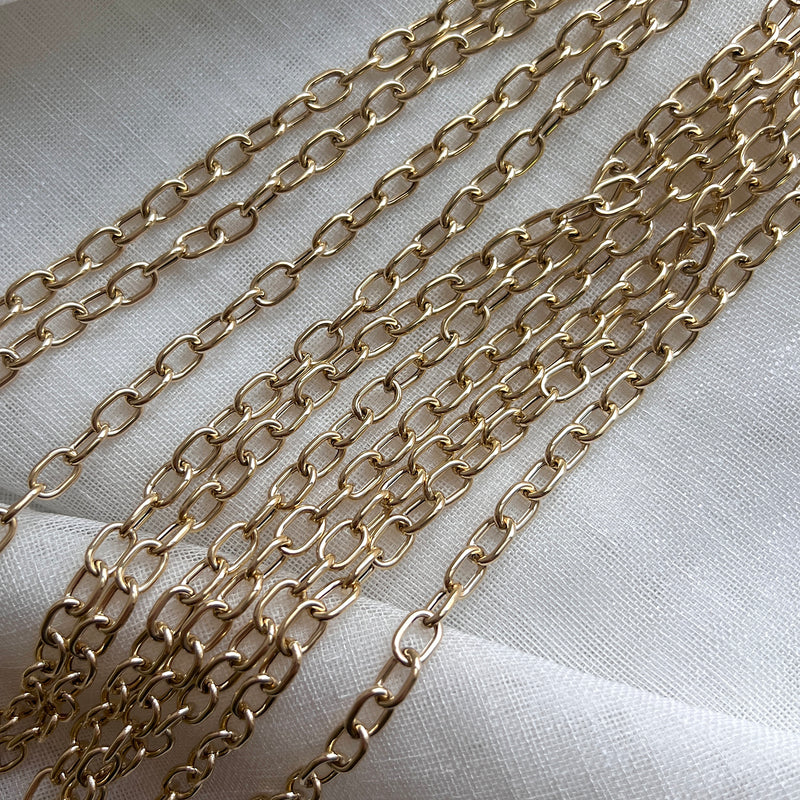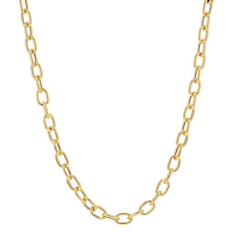 Our Large Rolo Chain is the perfect piece to have in your collection. The handmade oval links are the perfect adjustable chain to layer with charms or wear solo for a more minimal look. You can adjust the length you wear it from choker to medallion length. 14K yellow gold and available in 16, 18, 20 inch lengths. Also available in a bracelet.