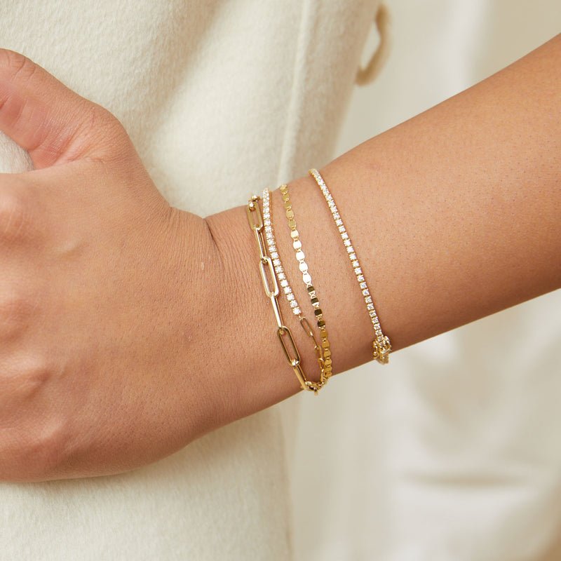 This dainty but eye catching bracelet is sure to make your wrist sparkle. Linked perfectly to deliver a mirror like glow, it's the perfect versatile piece to wear alone or dress up your wrist stack.