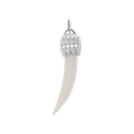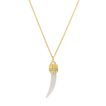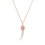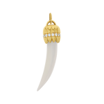 A natural Mother of Pearl Tusk representing a stunning force of nature, this diamond encrusted beauty is the edgy element to any outfit! Add an extra long chain and your favorite T-shirt for an effortless cool girl vibe!