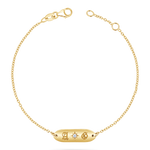 Our Best selling Oval Starset Initial Charm now has a bracelet to match! Our 14K Gold Oval Starset Initial Bracelet is as personal as it is timeless. it allows you to engrave your favorite initials and keep them by your side all day. Each ID bracelet gets hand set with a Starset Diamond in the center. Featuring a sleek, polished bar fixed securely on our cable chain, it’s perfect for layering or wearing solo.