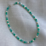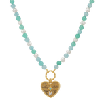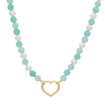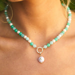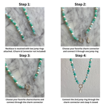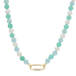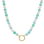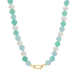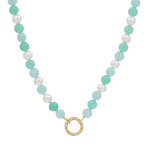 Now you can customize your favorite bead necklace with the change of a charm! Just add a Baby Gold connector and your favorite Baby Gold charm and snap this baby closed! A center drape custom piece combined with a unique Pearl and Aqua Bead necklace, makes a personalized statement like no other! This is THE latest custom piece you need to complete your neck stack!