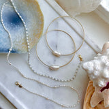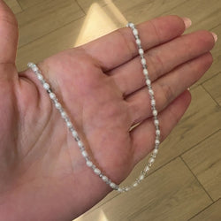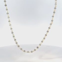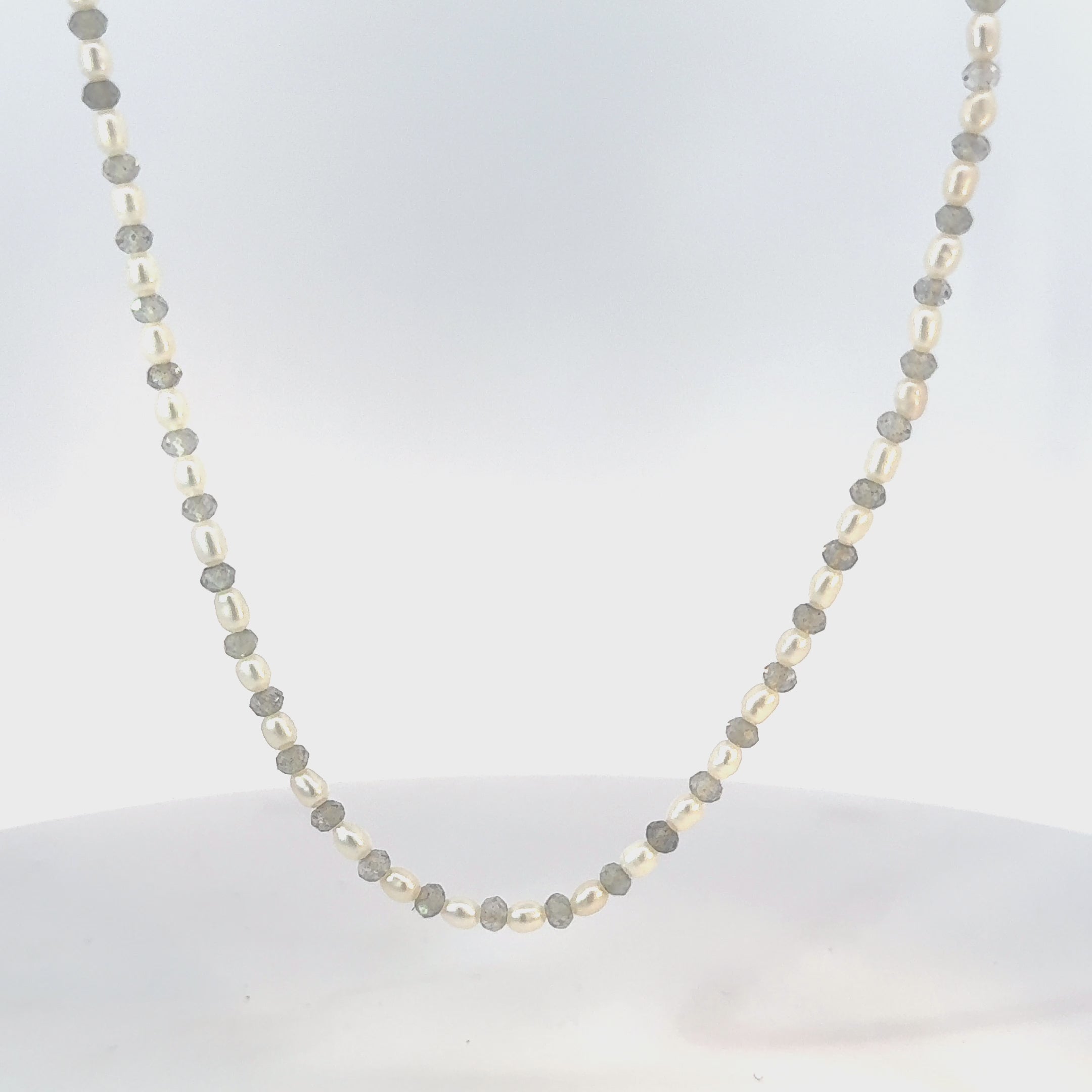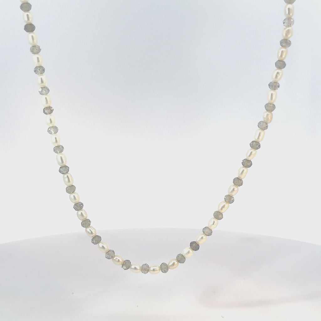 Embrace the subtle glow our Pearl and Labradorite Strand Necklace. A harmonious blend of timeless elegance and modern chic. This soothing combination features lustrous freshwater pearls radiating a soft glow, complemented by the enchanting flashes of color from polished labradorite stones. The pearls symbolize purity and sophistication, while the labradorite adds a touch of mystical charm, believed to enhance intuition and protect against negative energy. Perfect worn solo as a minimal statement or layered for a bolder look.