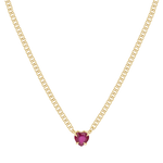Nothing makes a statement like a heart shaped Ruby, prong set onto a Cuban Link Chain. Each solitaire Ruby gemstone is handset by our master stone setters. The natural depth and color of the stone is a sure showstopper. Fastened by our lightweight Cuban Link chain, this piece is easy enough for daily wear and bold enough for a trendsetting tone.
