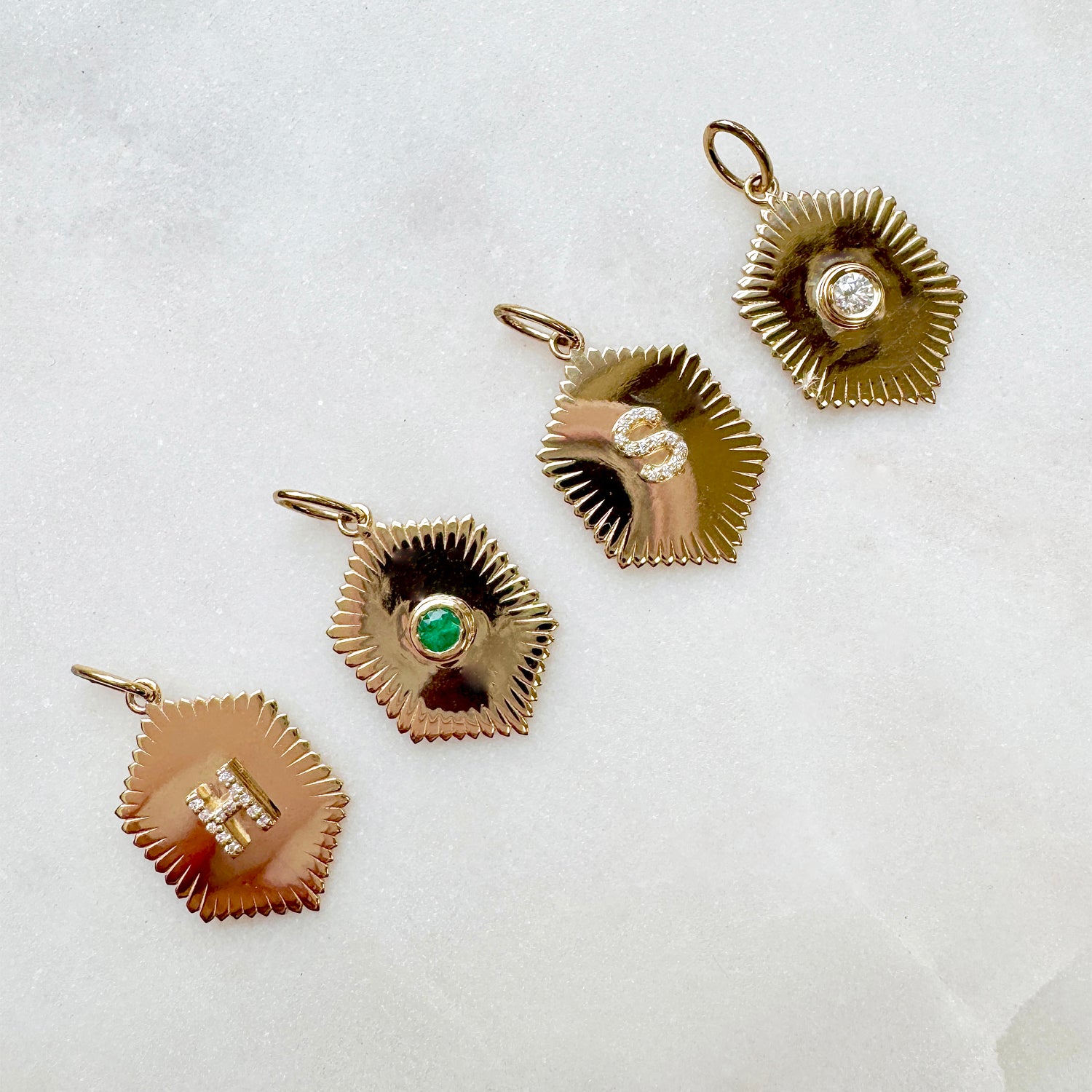 Your story, your shine, introducing our Sunburst Hexagon Letter Charm. This radiant 14K Gold pendant is engraved with your letter of choice and framed by a sunburst design that catches light, and feelings. Pavé-set diamonds illuminate your favorite initial and give it just the right amount of sparkle. Layer it, gift it, keep it forever