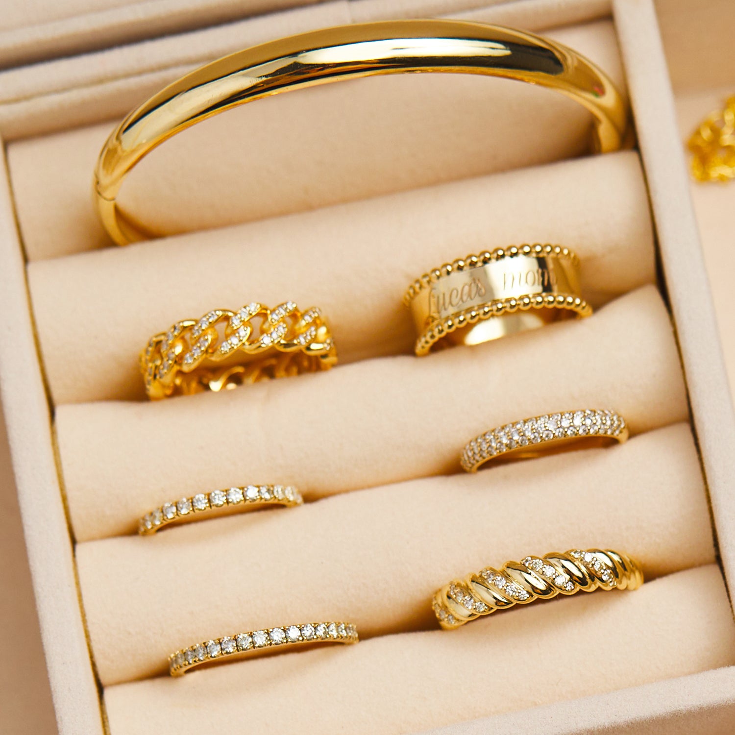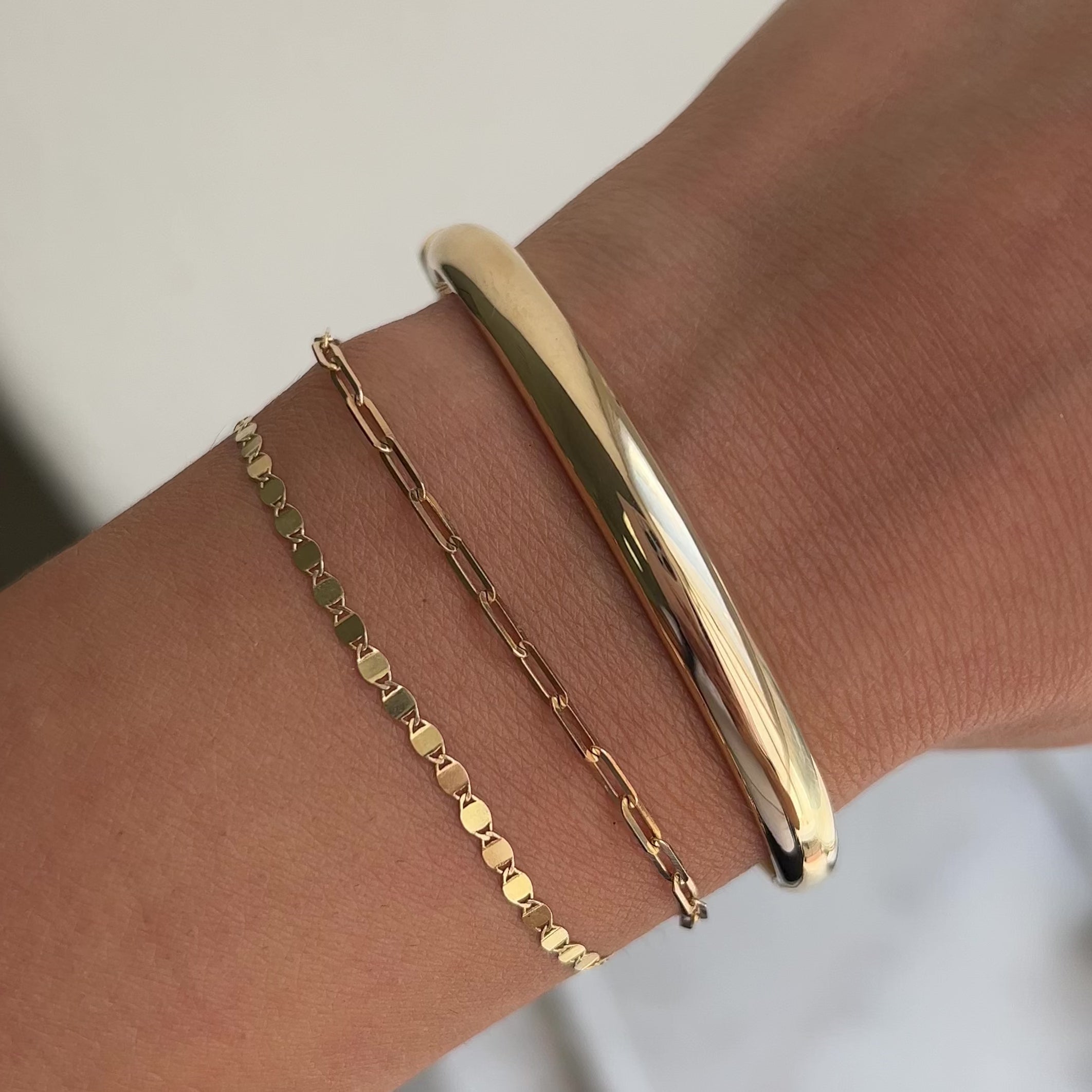 Classic bangles are back! Our Thick Dome Bangle embodies the epitome of timeless chic with major visual opulence. Brooding a casual luxury vibe that is lightweight and easy to wear, this 3mm-5mm  bangle bracelet is the perfect addition to any wrist stack. The push clasp makes this bracelet a snap to put on and take off. Pairs seamlessly with any trendy statement piece, but is significant enough to wear solo.