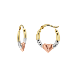 The prettiest Tri-Color combination of Yellow, White and Rose Gold makes this the ideal hoop to mix with any color metal and all your treasured pieces. Centered with a Rose Gold Puff Heart with diamond cut details and hinged securely with a lever back clasp. A delicate and dainty statement that will keep love close all day!