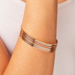 Our Tricolor Seven Stack Bangle is a celebration of timeless elegance with a modern twist. This unique 14K Gold piece features seven connected bands in a harmonious blend of yellow, white, and rose gold. Referred to as a " Seven Day Bangle" in some cultures, It is a symbol for love and friendship. Each band offers a distinct color, creating a dynamic, layered look in a single, seamless bangle. Perfect for those who love versatility, the tricolor design makes this piece easy to style with any jewelry collection. The smooth, polished finish adds sophistication, while the lightweight structure ensures comfortable wear all day. Where classic meets contemporary, bringing a balanced glow to your everyday style.